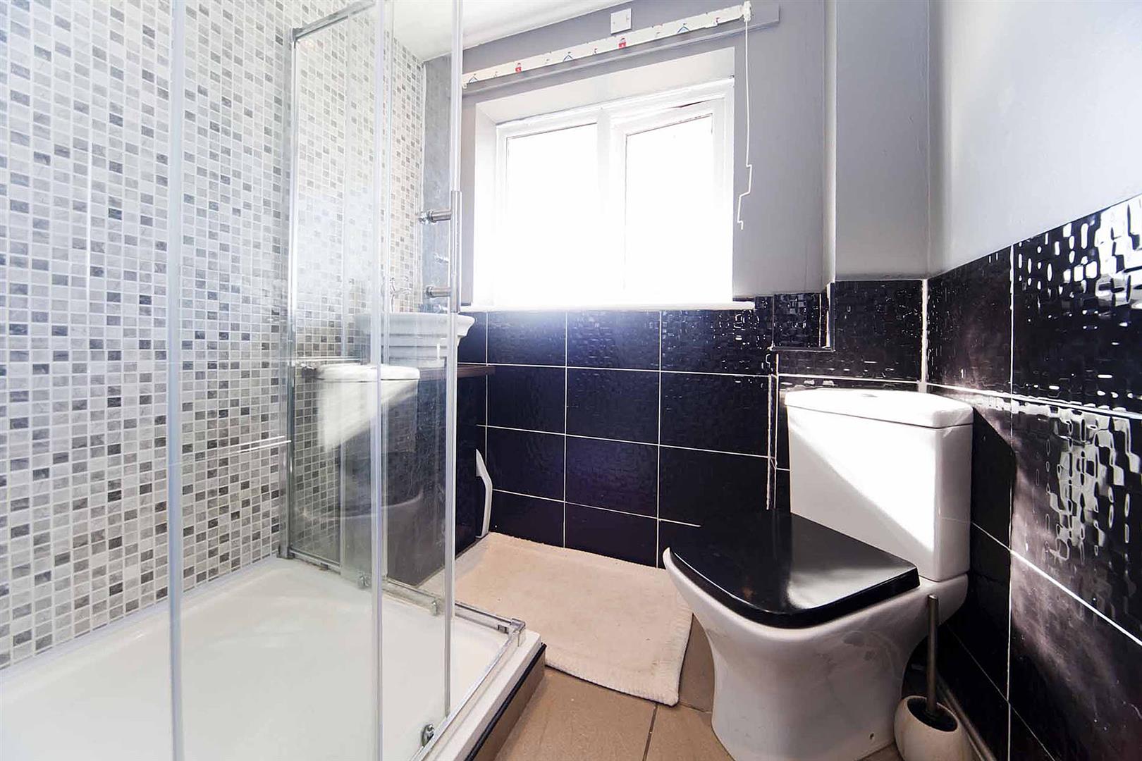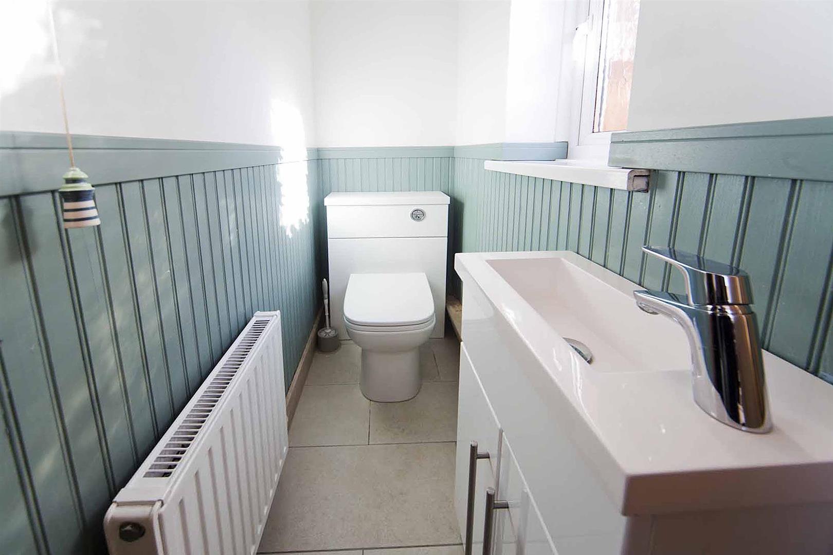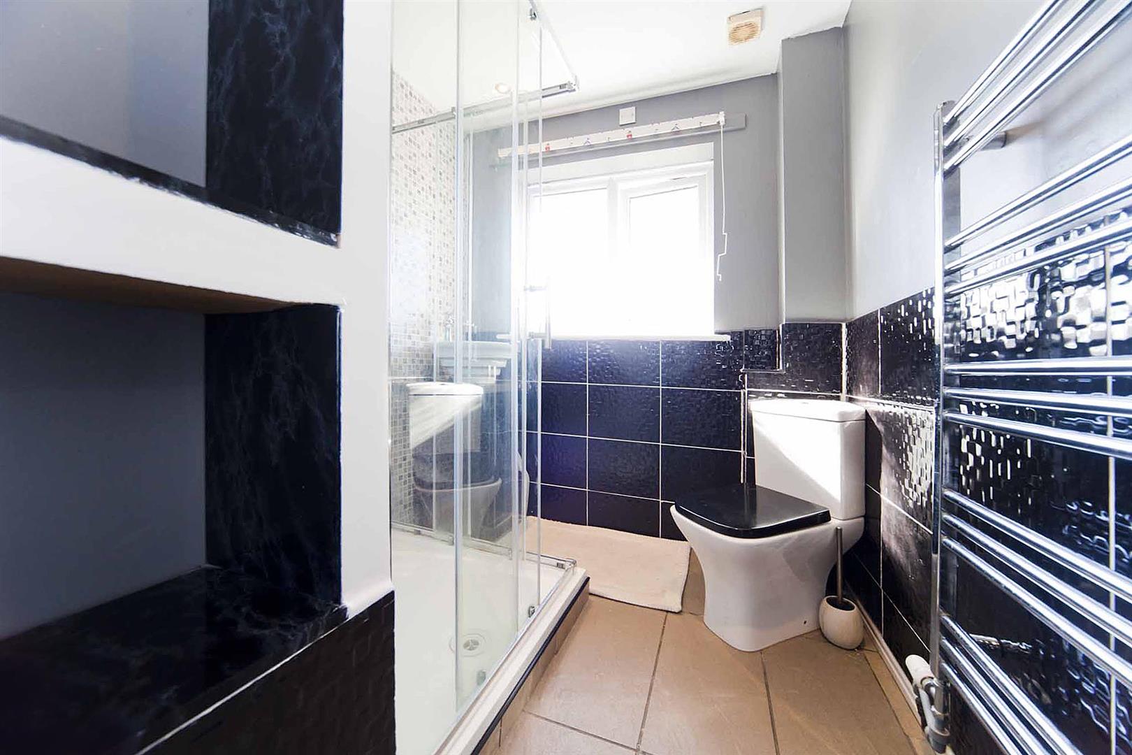 The family shower room comprises shower enclosure, close coupled WC and washbasin with complimentary tiling, chrome heated towel radiator, fitted shelving.