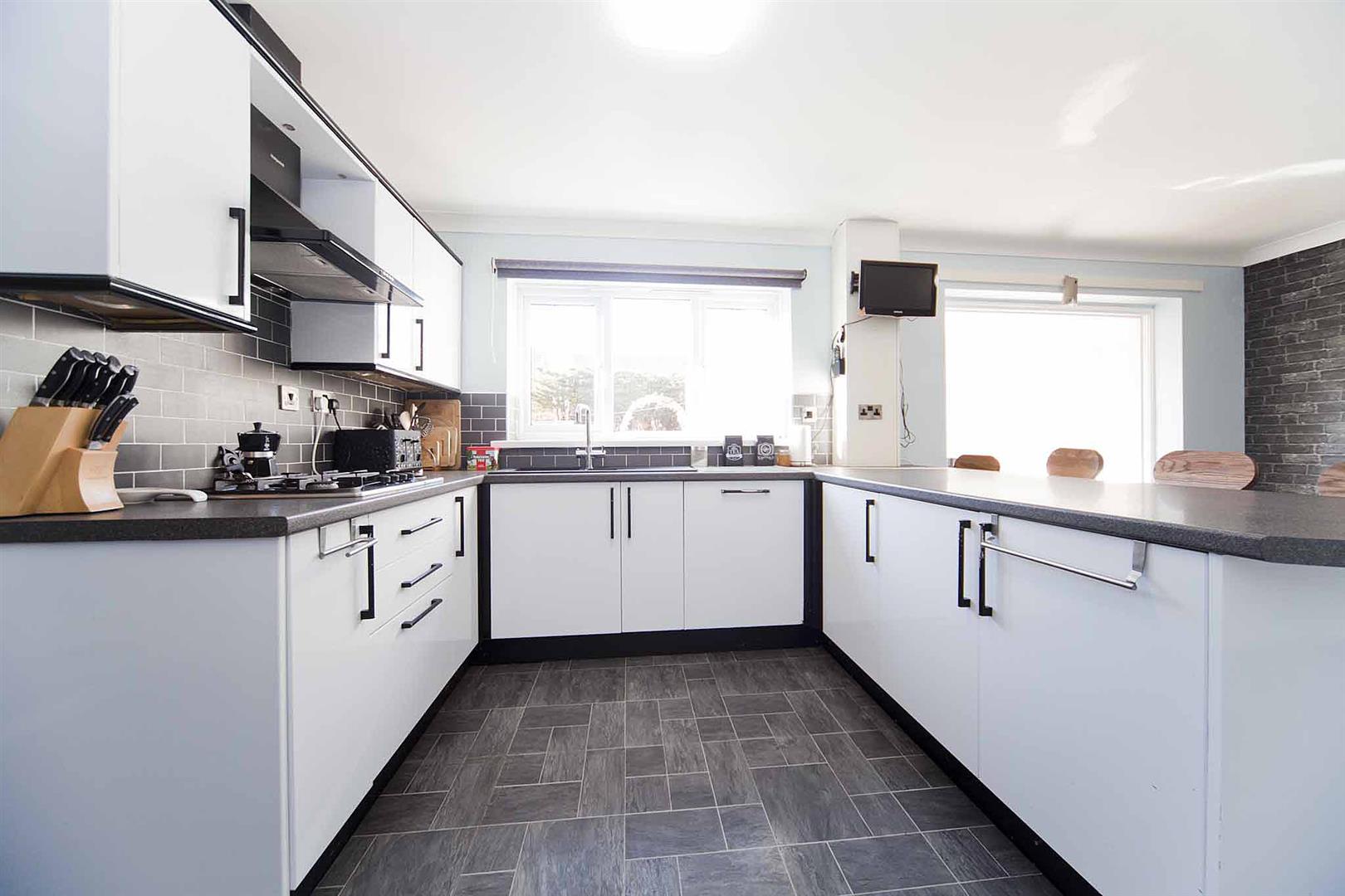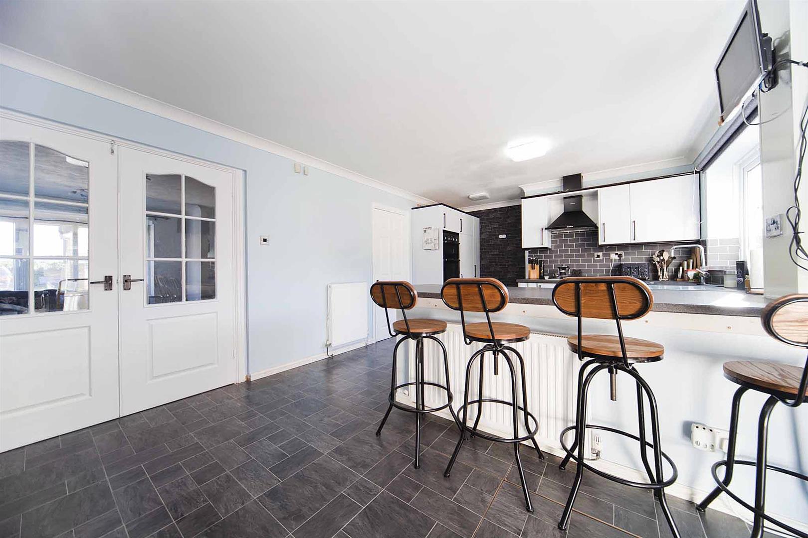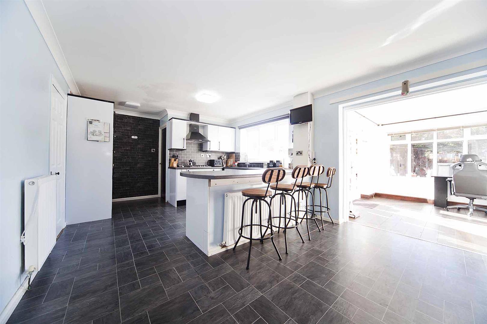 Open concept kitchen diner with ample space to dine and a kitchen fitted with high gloss white wall, base, and drawer cabinetry, complementary surfaces, subway tiled backsplash, peninsula breakfast bar, integrated dishwasher, integrated oven, integrated gas hob, integrated extractor, sink with chrome mixer tap, pantry, space for American fridge freezer.