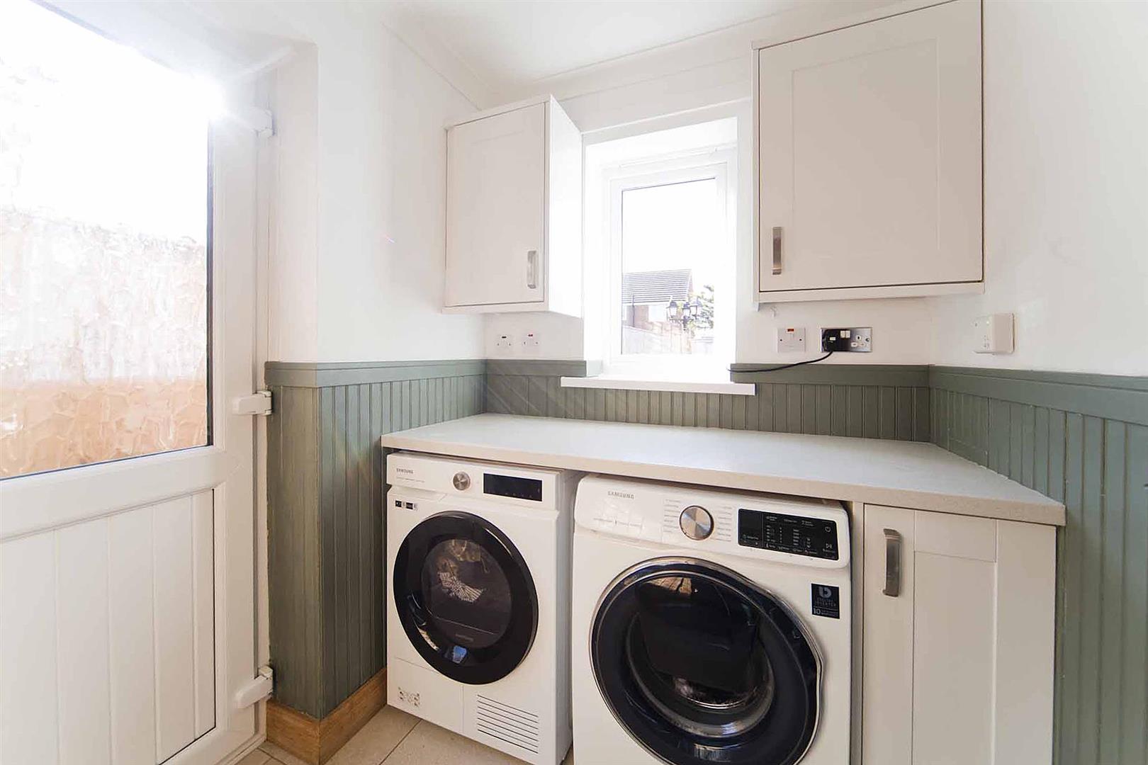 Useful utility room with plumbing for washing machine and space for tumble dryer, bespoke wall panelling, shaker style cabinetry, tiled floor, half glazed side elevation exterior door