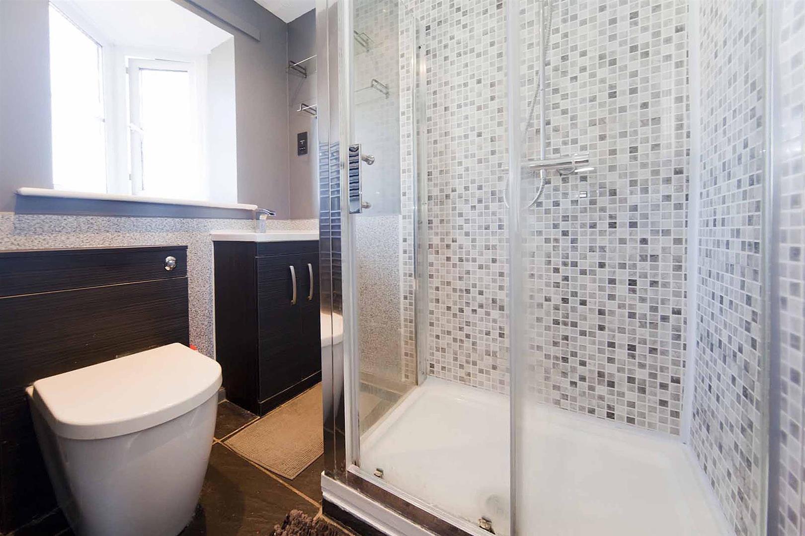 Ensuite shower room comprising shower enclosure, concealed cistern WC and vanity washbasin, complimentary tiling.