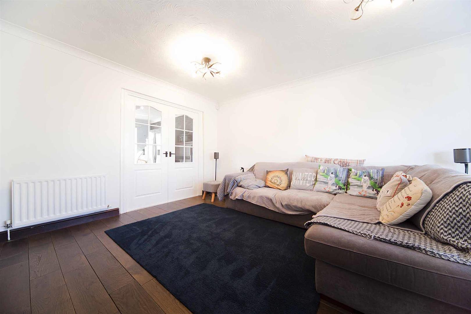 Spacious lounge with bay window to the front elevation, laminate flooring, decorative coving, immaculate decor, double doors which lead into;