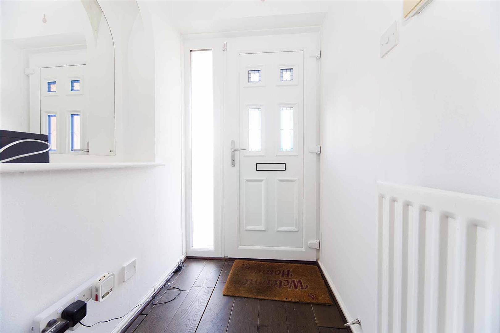 Entrance hallway with stairs at the first floor accommodation, immaculate decor, laminate flooring, feature arch.