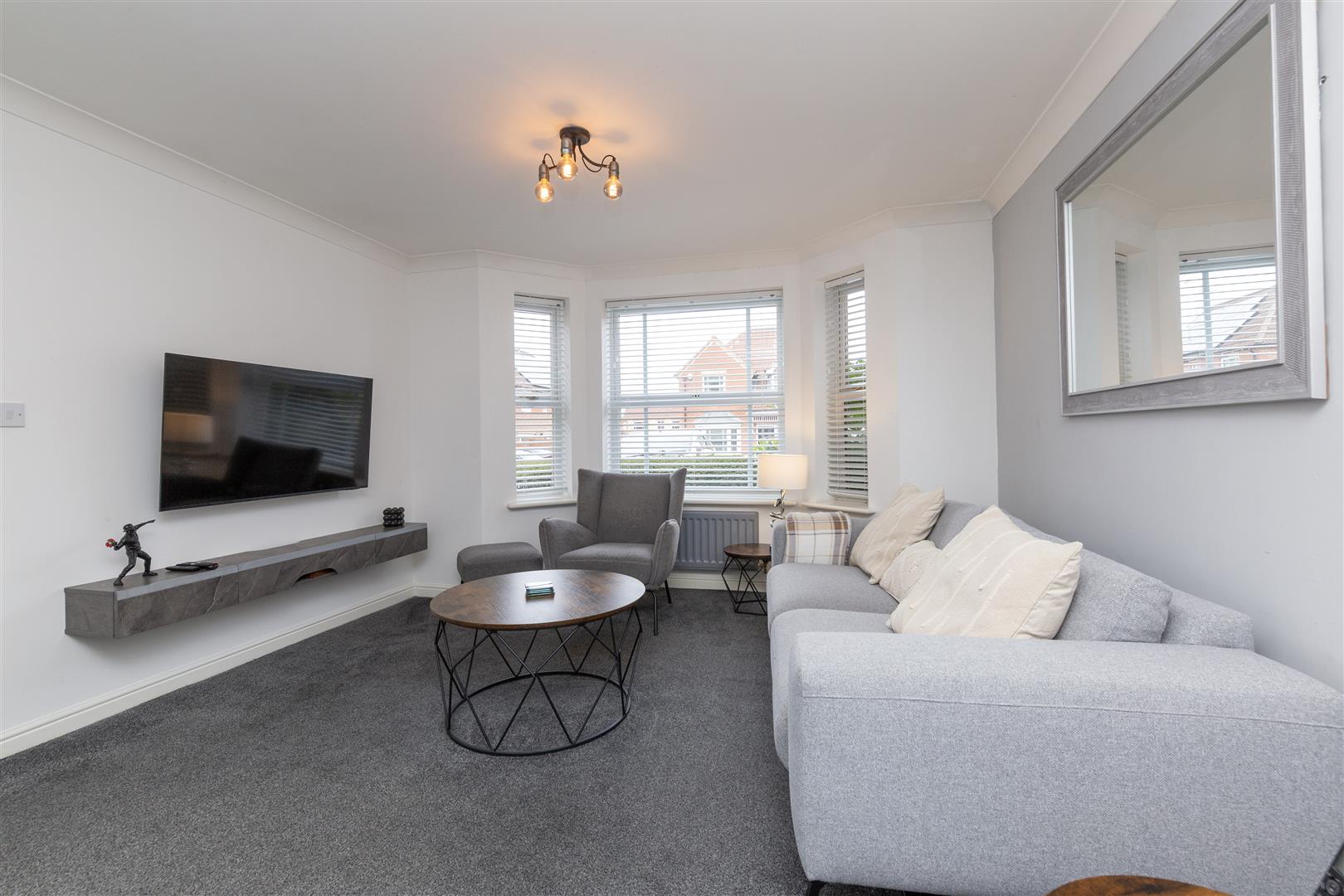 Contemporary open concept lounge/ diner/ kitchen with two windows ( one of which is a bay), decorative coving, spacious lounge and dining area with the kitchen comprising modern wall, base and drawer cabinetry, complimentary heat resistant surfaces, mosaic tiled backsplash, integrated oven, integrated gas hob, stainless multifunction extractor hood, space for fridge freezer, stainless sink with chrome mixer swivel tap, plumbing for washing machine, recessed spotlights, tiled floor.