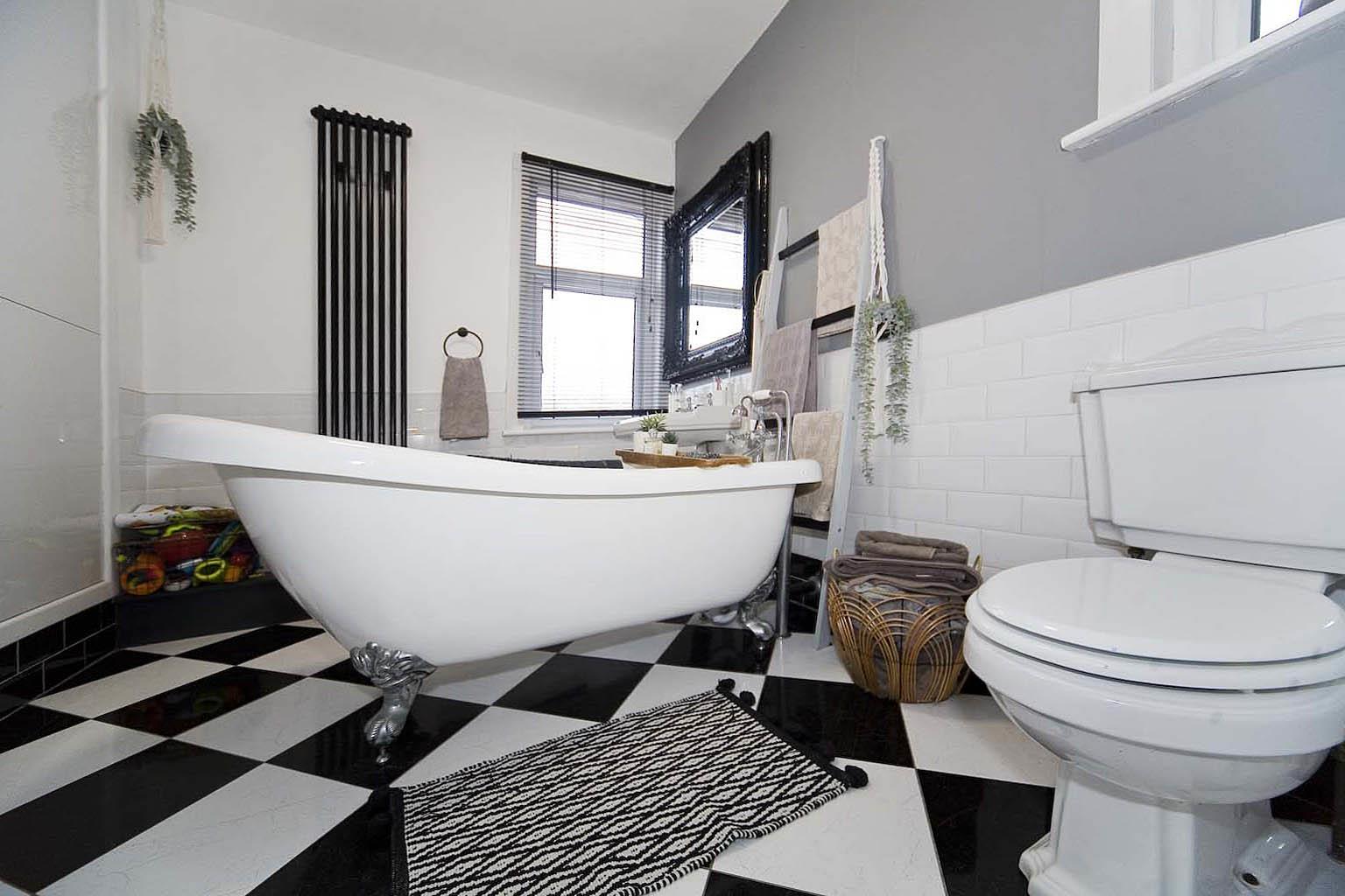 The stunning large family bathroom comprises freestanding slipper bath with floor standing Victorian telephone shower head taps, quadrant shower enclosure, close coupled WC and pedestal wash basin, stylish complimentary tiling, column radiator.