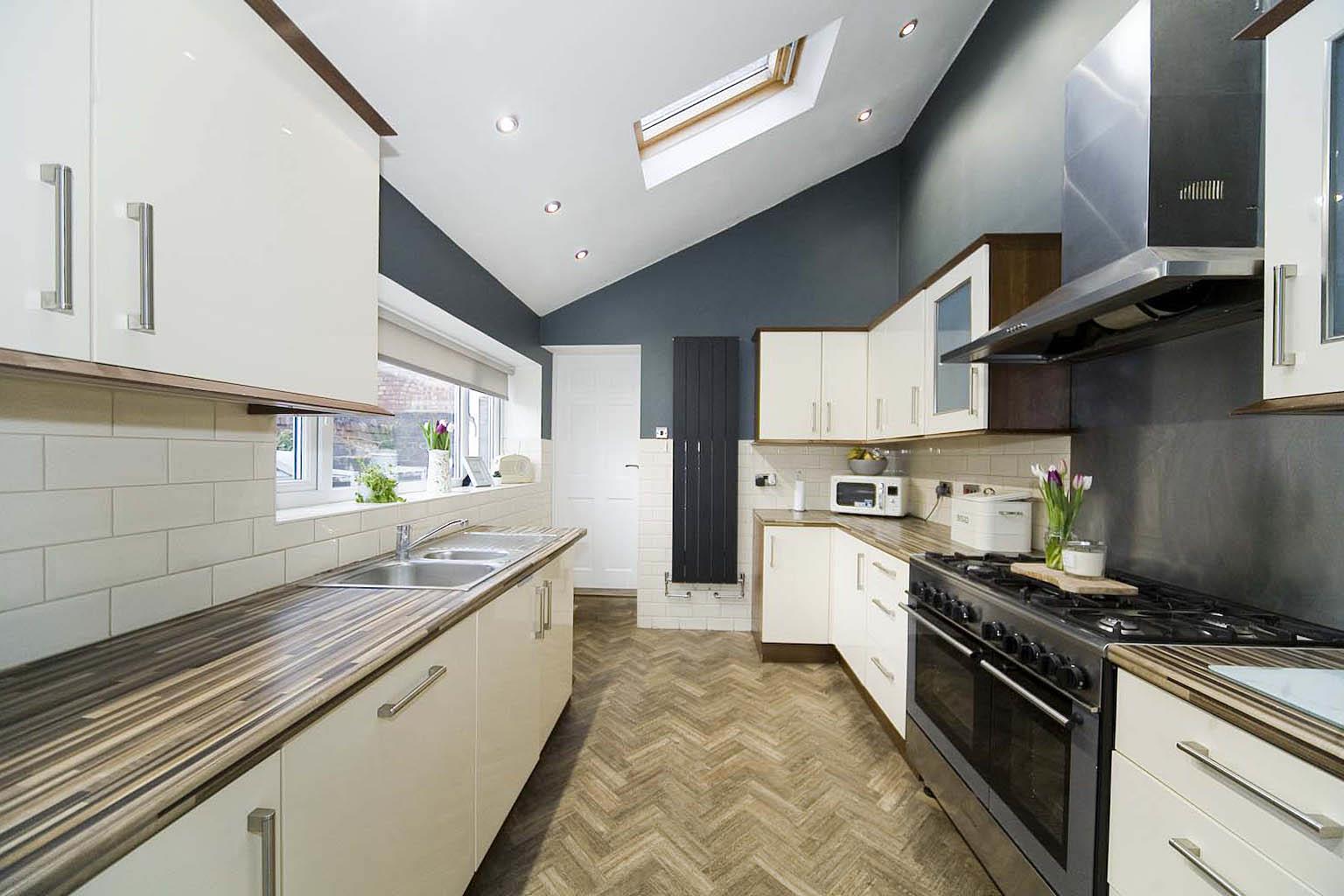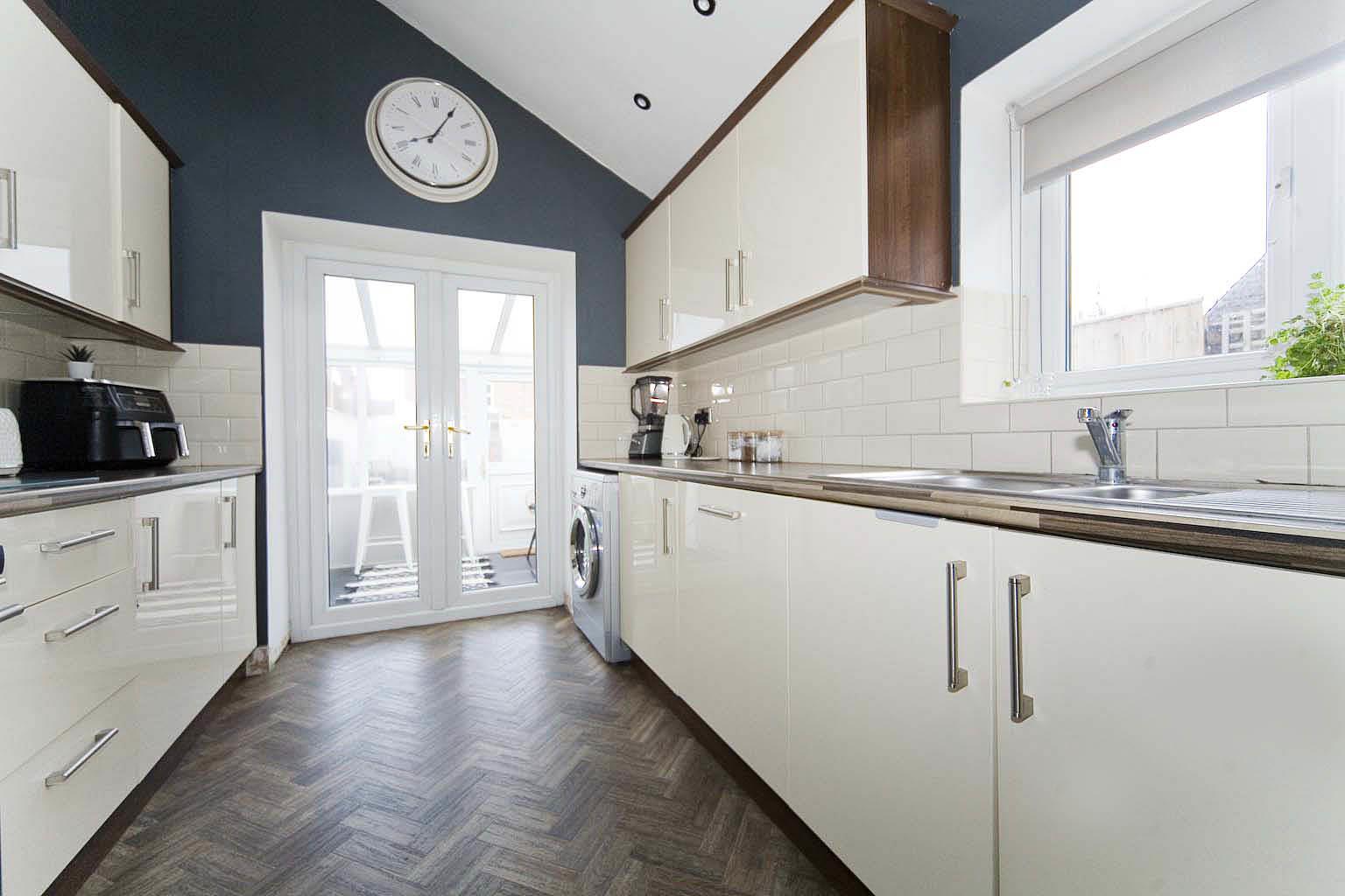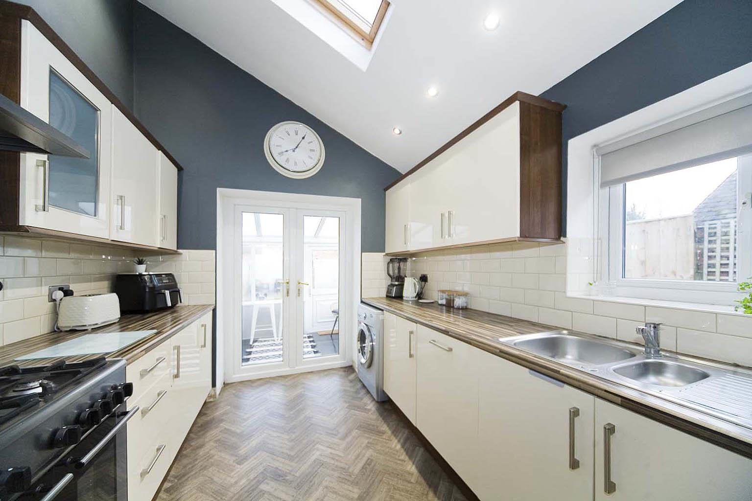 Well equipped modern kitchen fitted with a host of wall, base and drawer cabinets, complimentary surfaces, subway tiled backsplash, space for range cooker, integrated multifunction extractor hood, plumbing for washing machine, stainless sink with mixer tap, recessed spotlights, column radiator, Velux window, French doors.