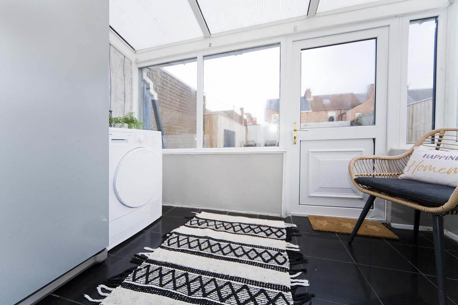 Useful utility room, tiled flooring, rear elevation access door to garden.