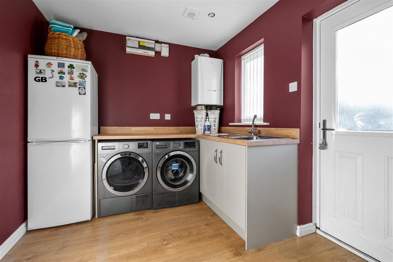 As you move into the heart of the home, you find yourself in the expansive open plan kitchen/dining room. The kitchen is equipped with top-of-the-line appliances, including an integrated dishwasher, double oven, electric hob & extractor fan. Wooden countertops provide a sleek, durable surface as well as offering ample cooking space. Off to the side of the kitchen, a utility room offers additional functionality, plumbing for a washing and tumble dryer, extra storage, a second sink, access into the double garage and a doorway leading to the garden, perfect for managing day-to-day tasks with ease.