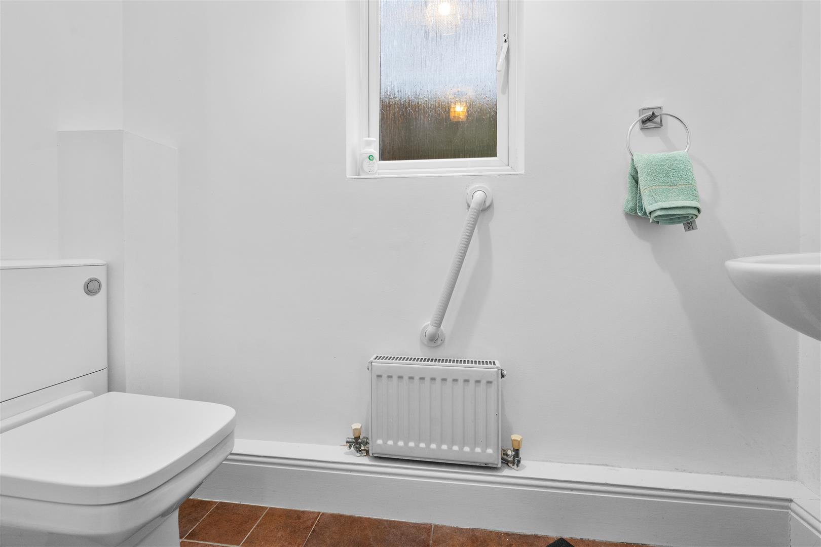 Guest cloakroom comprising close coupled WC and pedestal wash basin in desirable white porcelain, tiled floor.