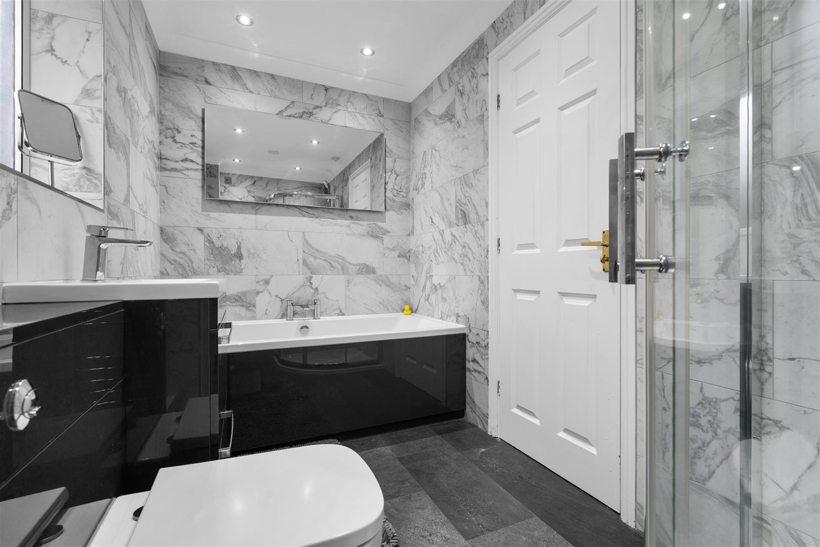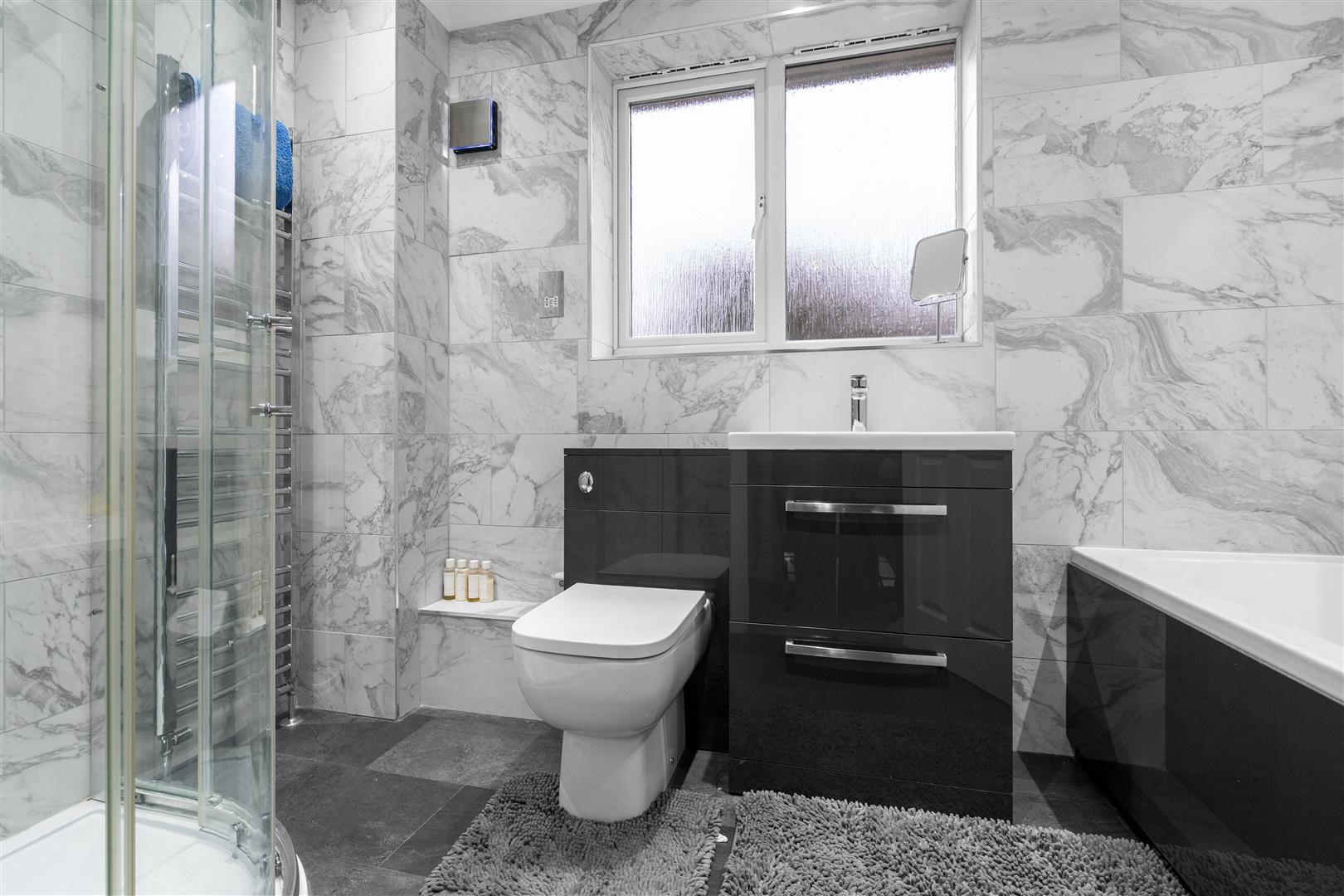 The stylish family bathroom comprises bath, quadrant shower enclosure, concealed cistern WC, and vanity wash basin combination storage unit, fully tiled, heated towel radiator, recessed spotlights.