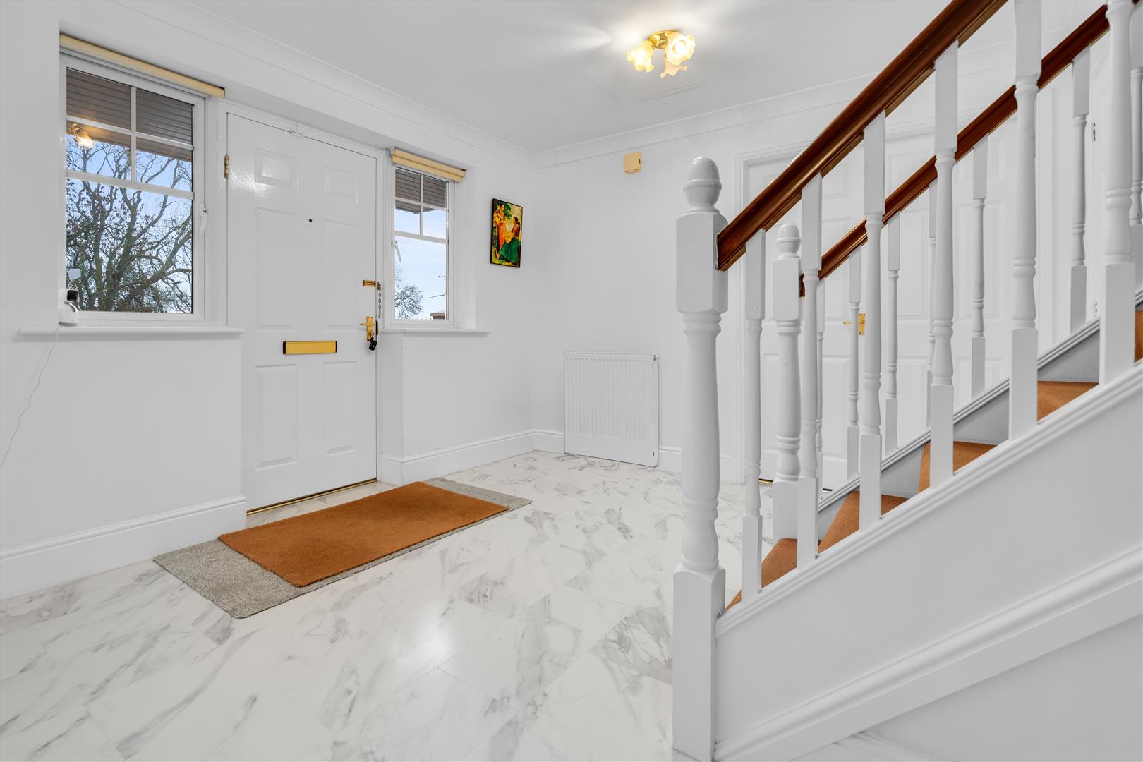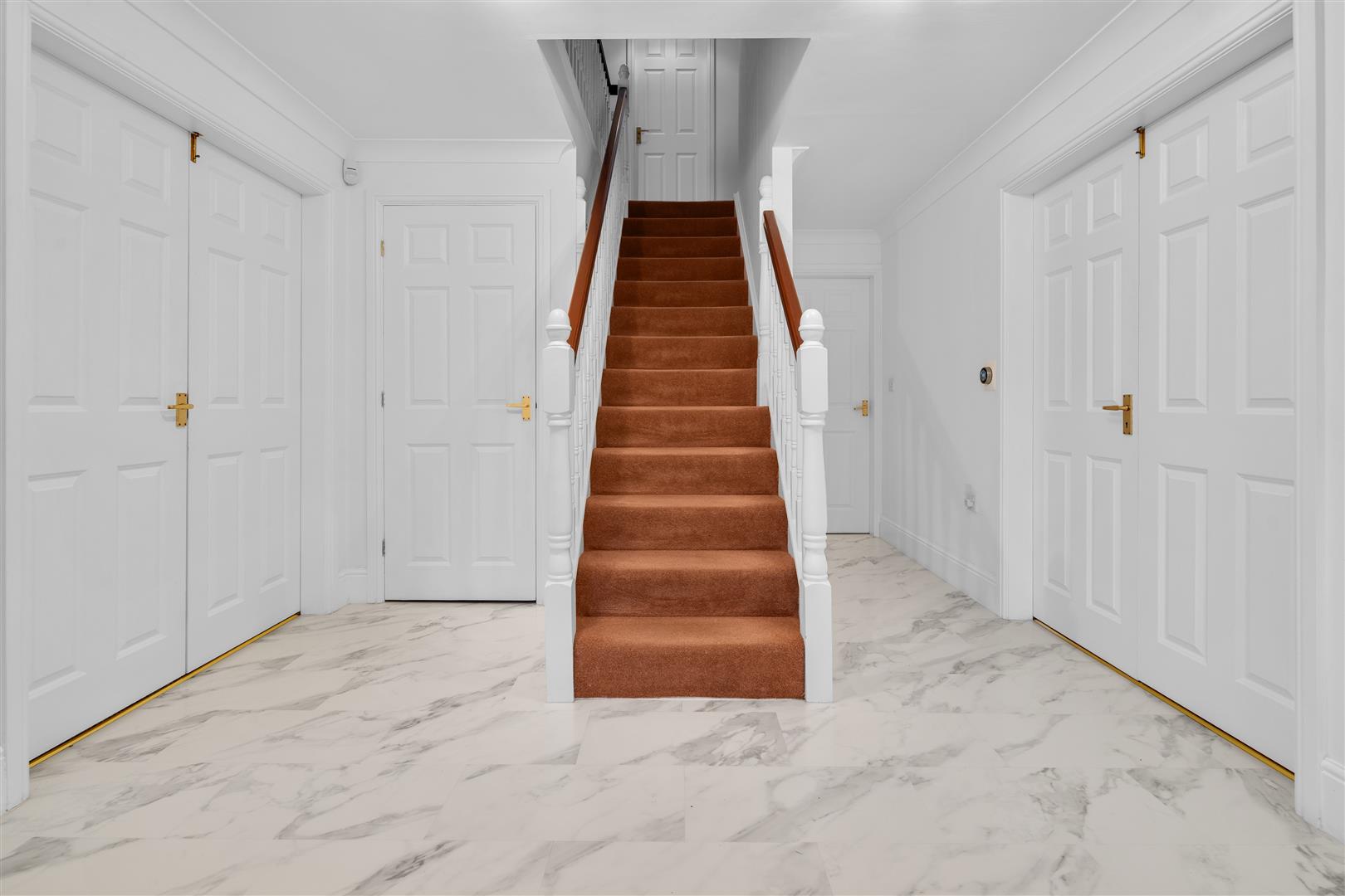 Inviting entrance hall with central staircase leading to the first floor accommodation, dual front elevation windows, marble tiled flooring, impeccable decor, decorative coving, with two fitted storage cupboards.