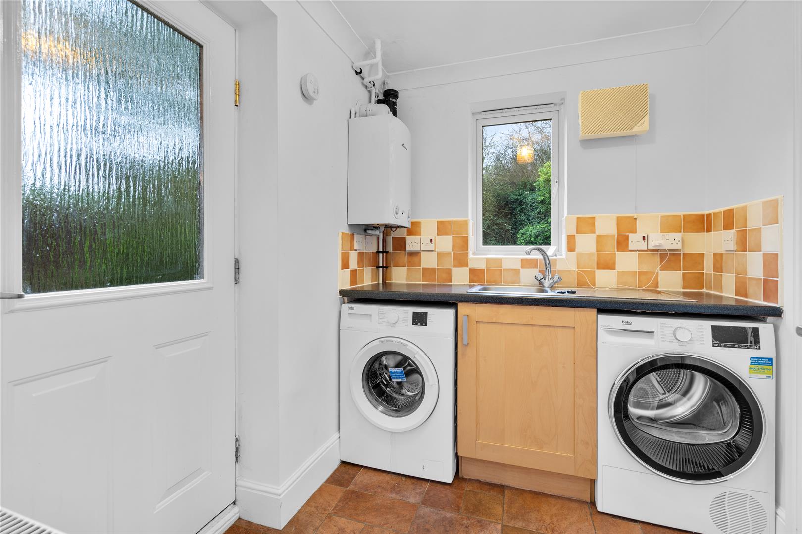 Useful utility room with plumbing washing machine and space for tumble dryer, fitted with shaker style base cabinet, complimentary surfaces, tiled backsplash, stainless sink with chrome mixer tap, half glazed exterior door.