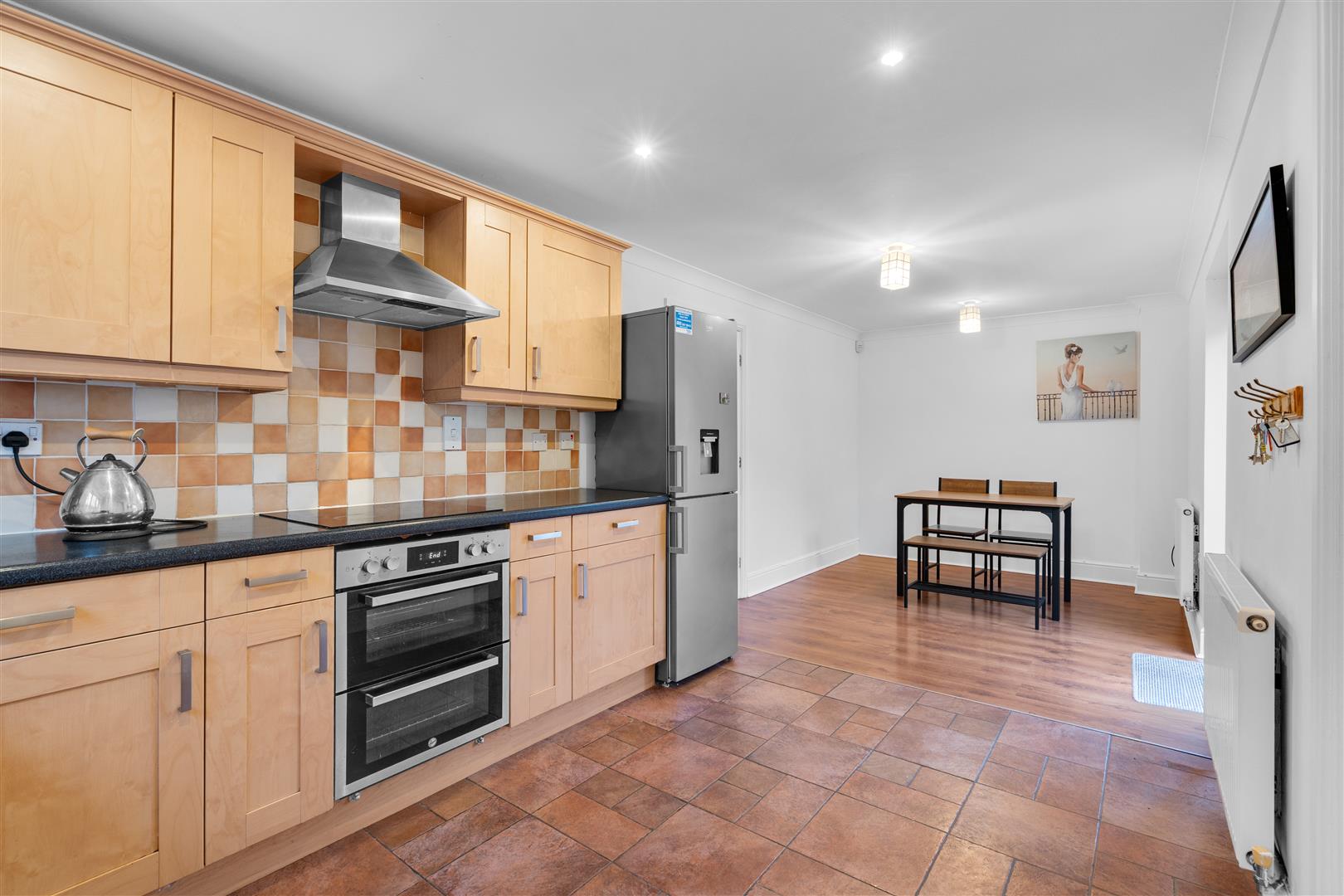 Open concept kitchen diner fitted with a wealth of contemporary wall, base and drawer shaker style cabinetry, complimentary surfaces, tiled backsplash, integrated double oven, integrated ceramic hob, stainless multifunction extractor, space for fridge freezer, space for dishwasher, cast sink with mixer tap, ample space to dine, recessed spotlights, French doors which open to the rear garden.