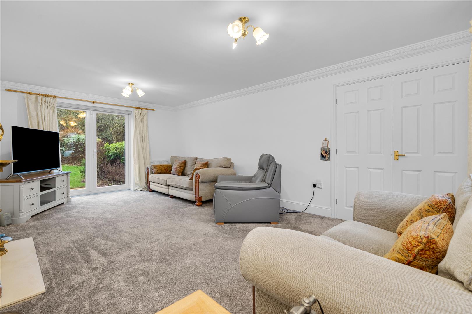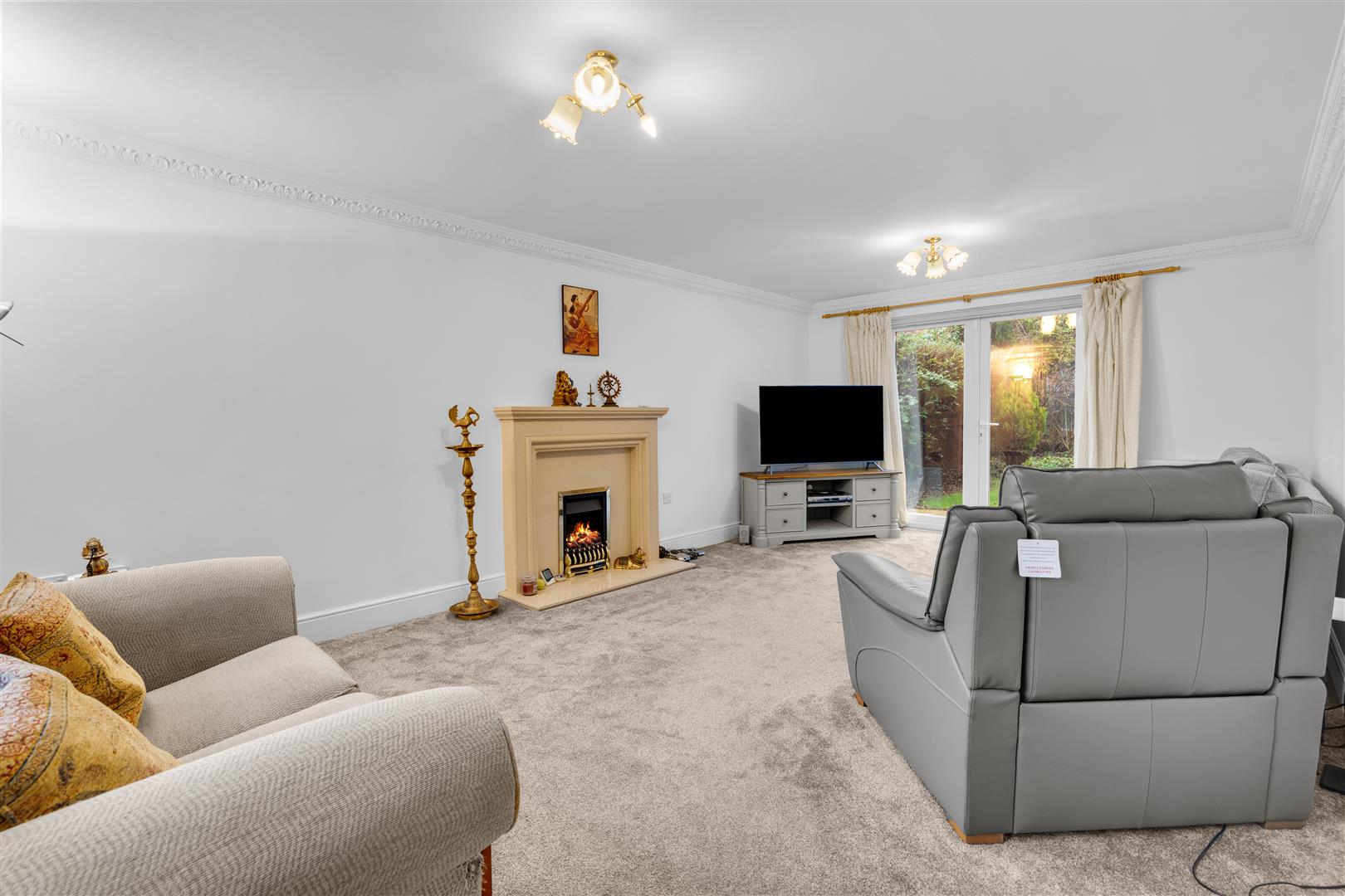 Dual aspect lounge entered via double doors, benefiting feature fireplace with coal effect fire, immaculate decor, decorative coving, window to the front elevation and French doors leading to the rear garden.