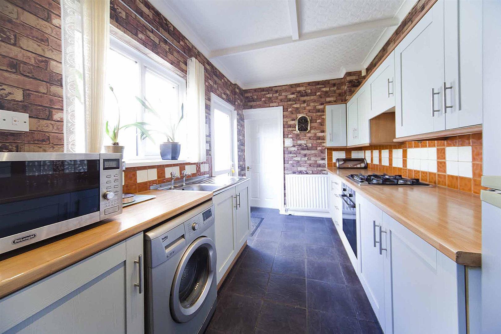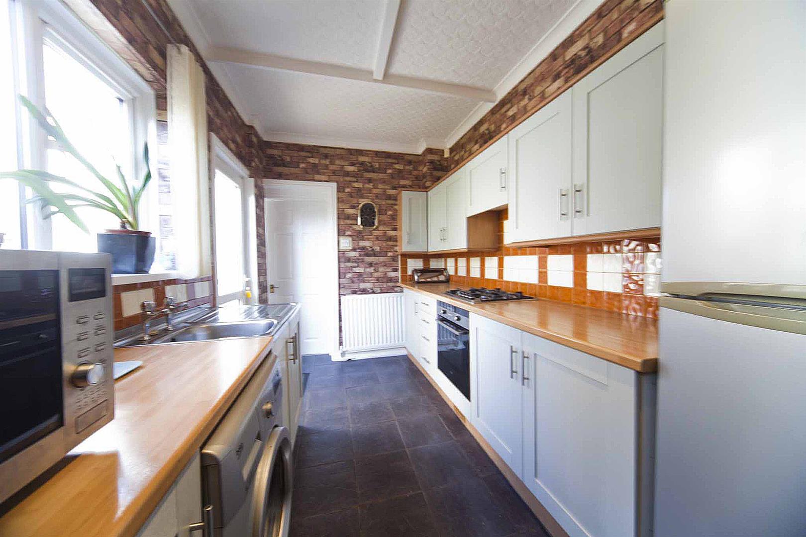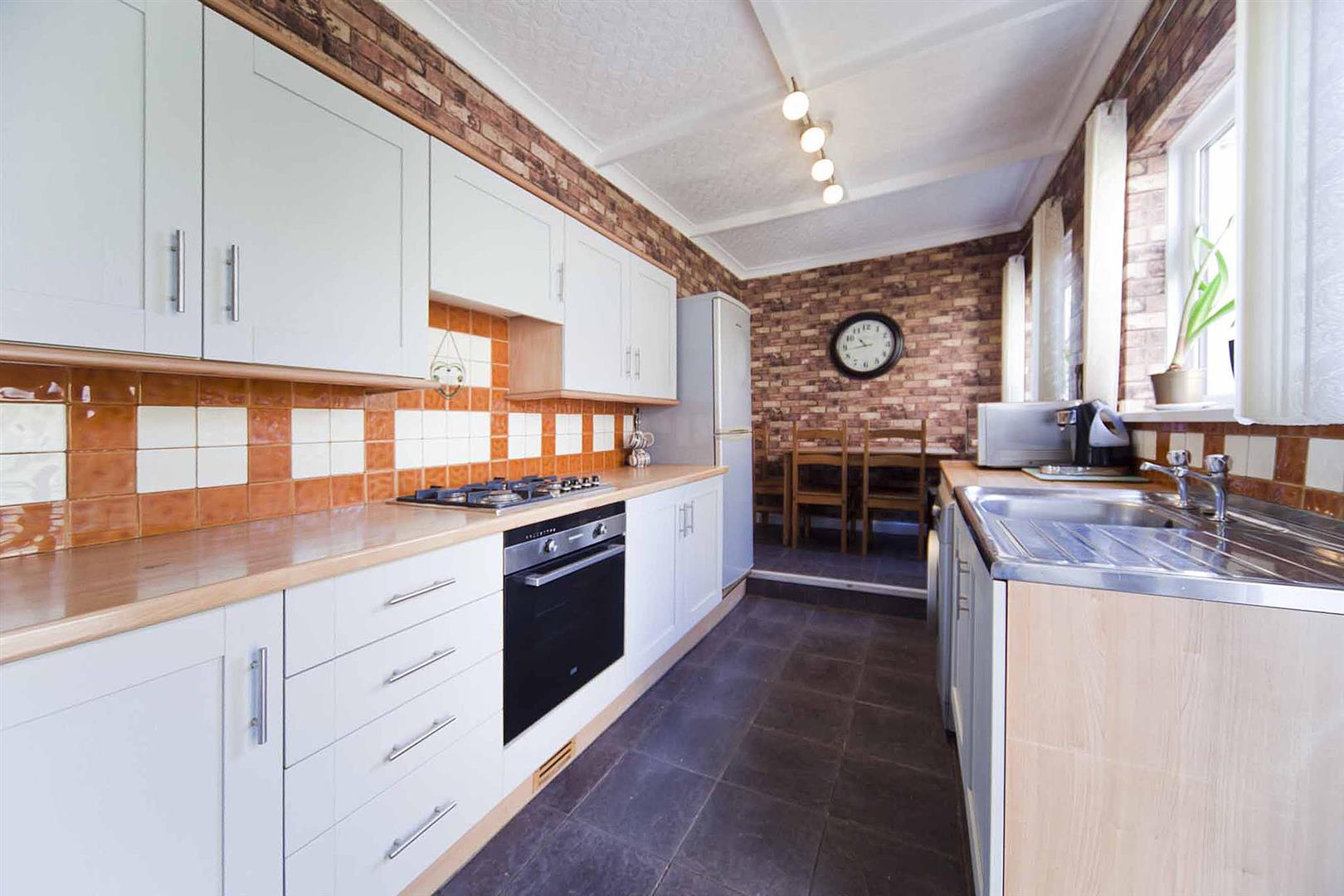 Well equipped kitchen diner, fitted with a selection of shaker style wall, base and drawer cabinets, complimentary heat resistant surfaces, co ordinating backsplash, integrated oven, integrated gas hob, stainless sink, plumbing for washing machine, space for fridge freezer, ample dining space, tiled floor.
