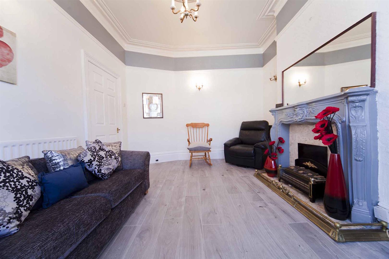 Lounge with front elevation bay window, Louis fireplace with electric fire, laminate flooring, deep coving and picture rail, modern decor.