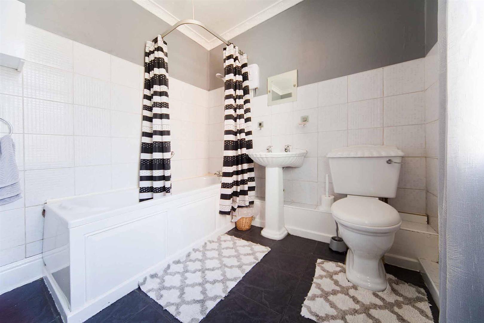 The spacious bathroom comprises bath, over bath shower, close coupled WC and pedestal wash basin, complimentary tiling.