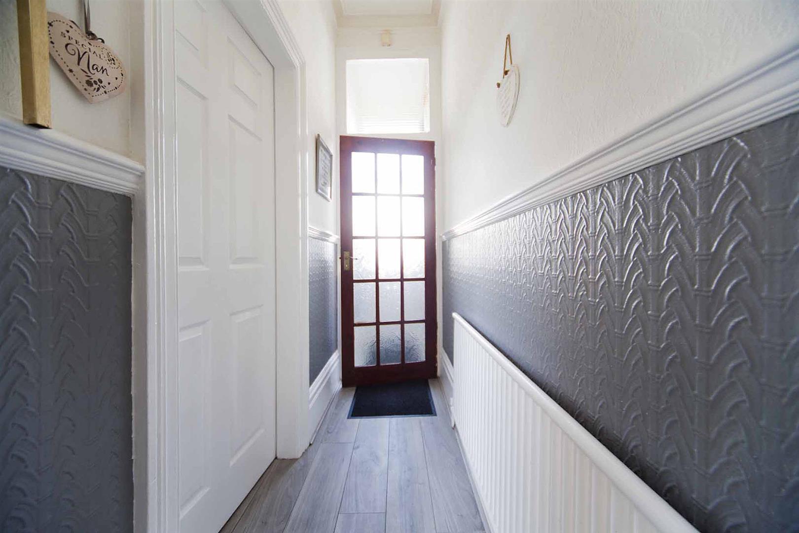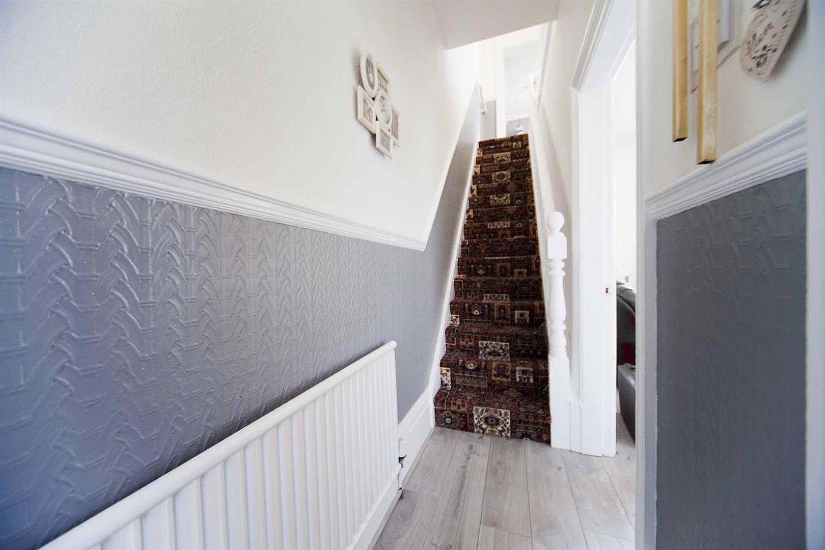 Entrance hall with stairs to the first floor, laminate flooring, dado rail.