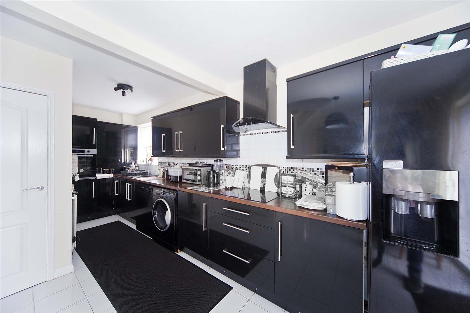 Fantastic open plan kitchen/diner/family room comprising sleek high gloss wall, base and drawer cabinets, complimentary surfaces, tiled backsplash, integrated oven, integrated ceramic hob, integrated extractor, stainless sink with chrome mixer tap, plumbing for washing machine, space for dishwasher, space for American fridge freezer, tiled floor, ample dining and seating areas, fitted storage cupboard, neutral decor, patio doors into;