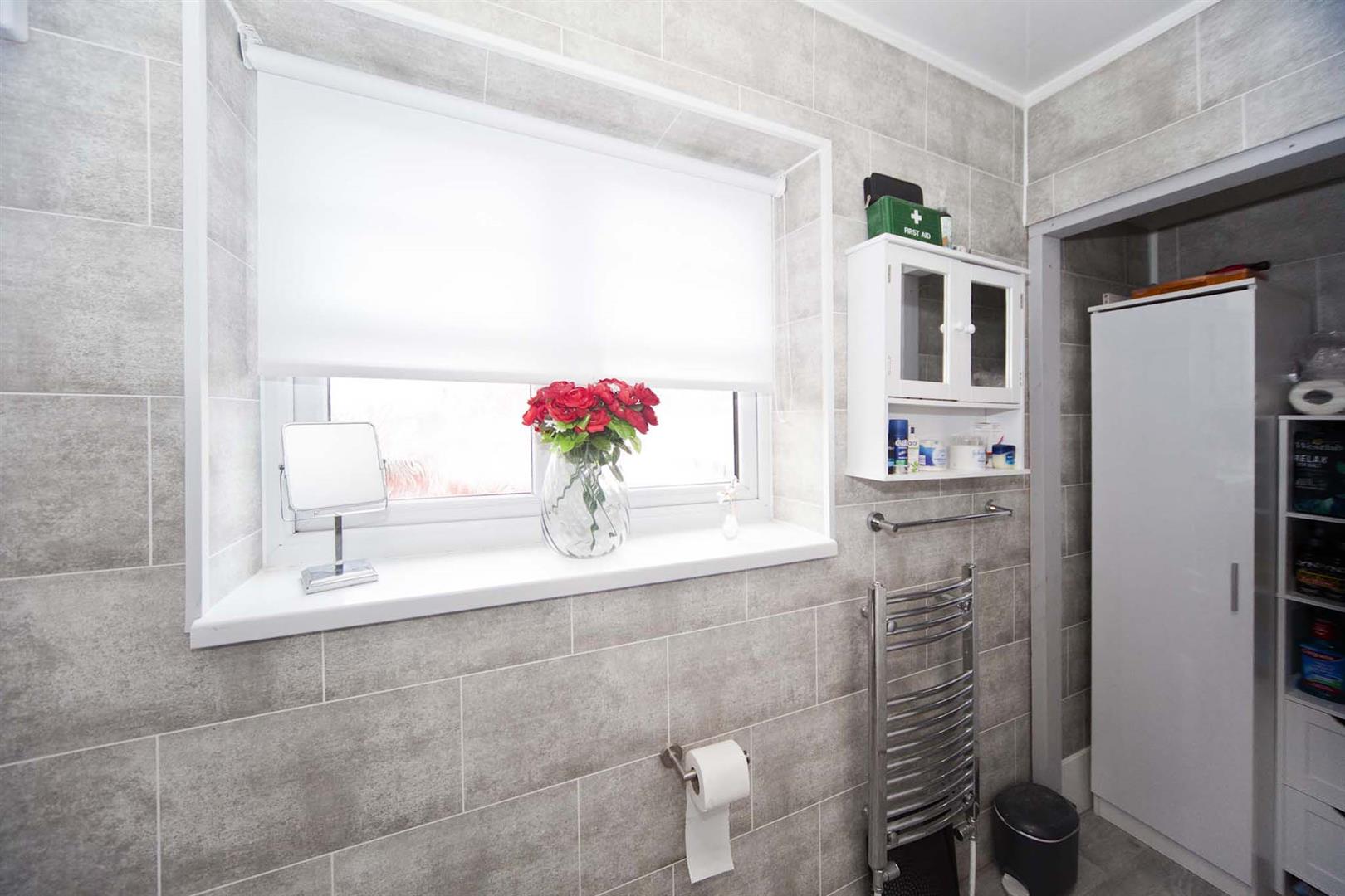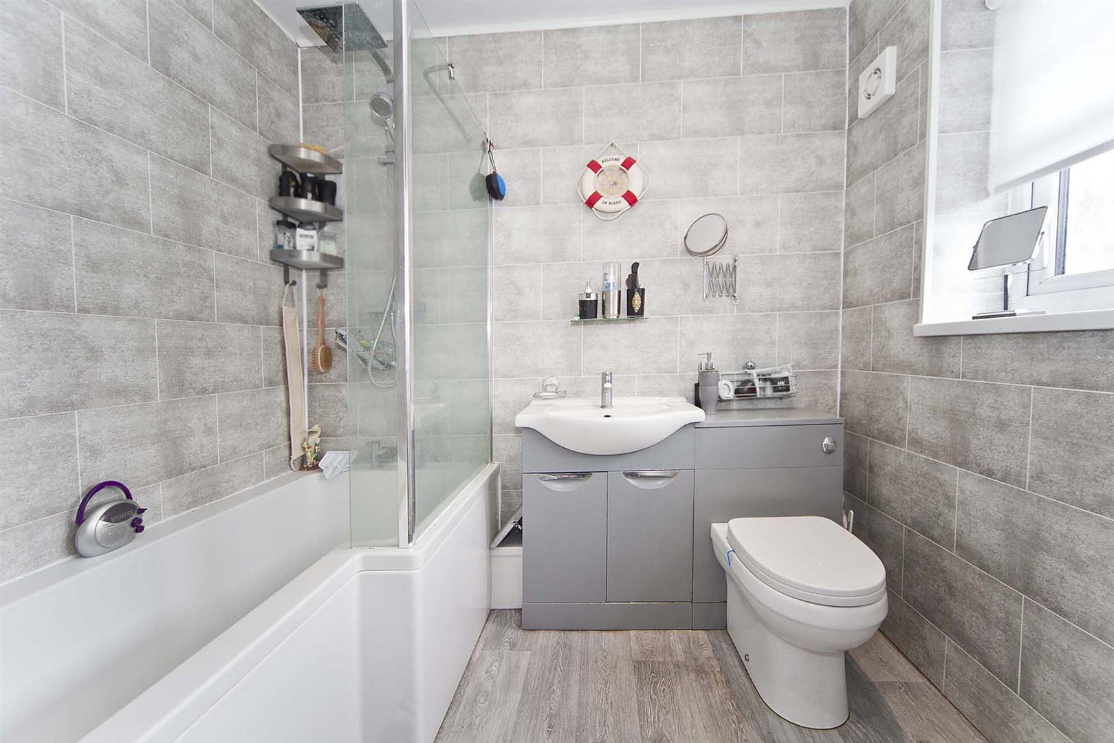 The stylish family bathroom comprises 'P' shaped bath, over bath shower and glass shower screen, concealed cistern WC and vanity wash basin combination unit, chrome heated towel radiator, storage area.