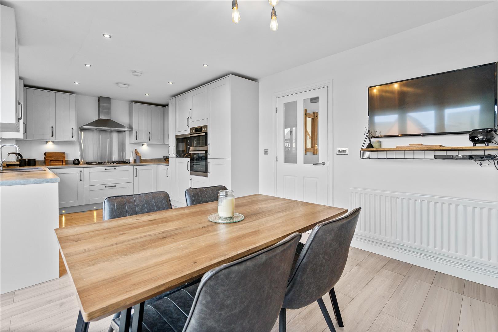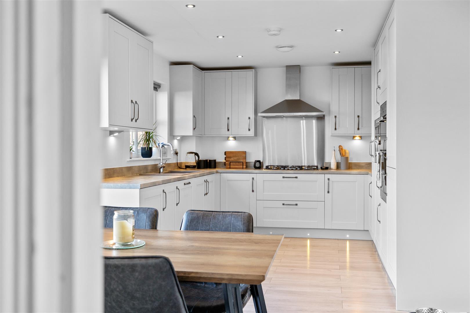 Fantastic open concept kitchen/diner/family room fitted with an array of sleek two tone wall, base and drawer cabinetry, complimentary surfaces, stylish subway tiled backsplash, integrated electric oven, integrated gas hob, integrated fridge freezer, integrated dishwasher, space for appliances, peninsular breakfast bar, ample space to dine and relax, recessed spotlights, immaculate decor, French doors opening to the garden, laminate flooring.