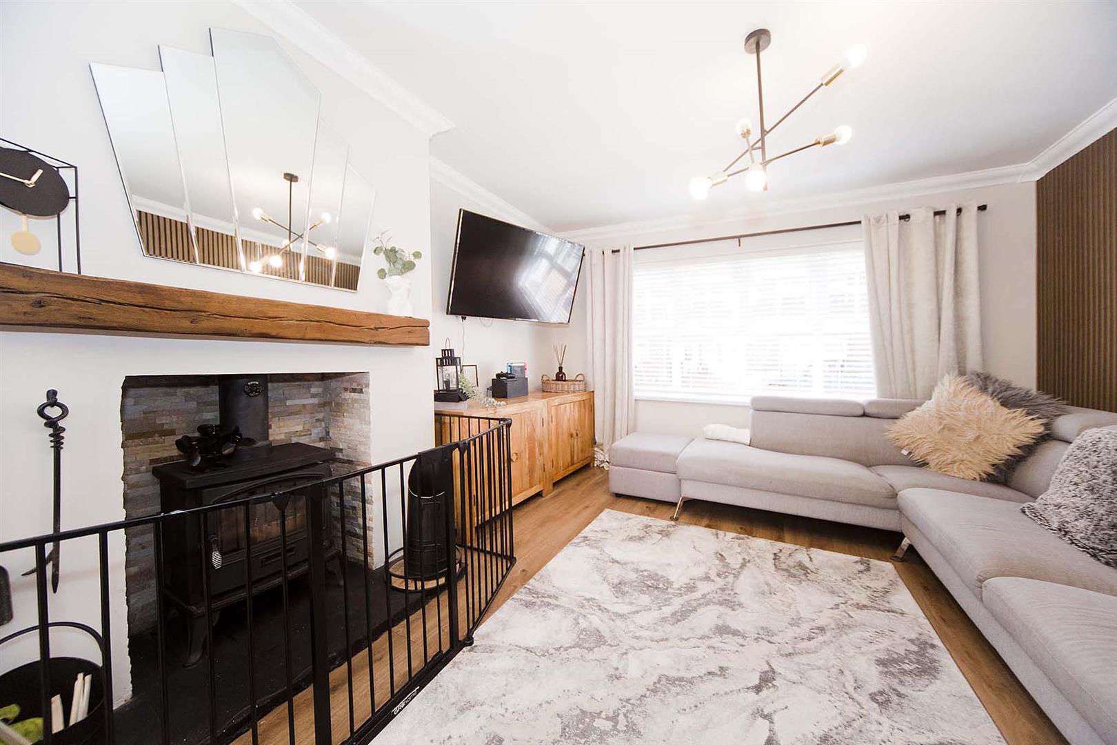 Spacious open plan lounge diner with window to the front of the property with feature open fireplace, cast log dual fuel burner, slate hearth and wooden over mantle, laminate flooring, anthracite radiators, contemporary decor, decorative coving, and open plan to;