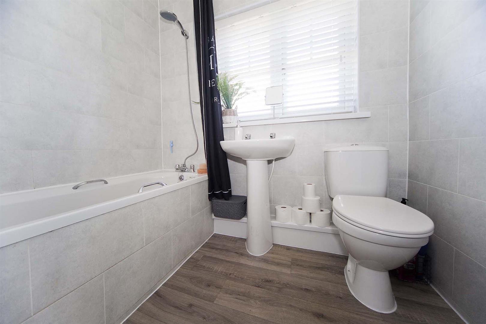 The family bathroom comprises bath, over bath shower, close coupled WC and pedestal wash basin, complimentary tiling.