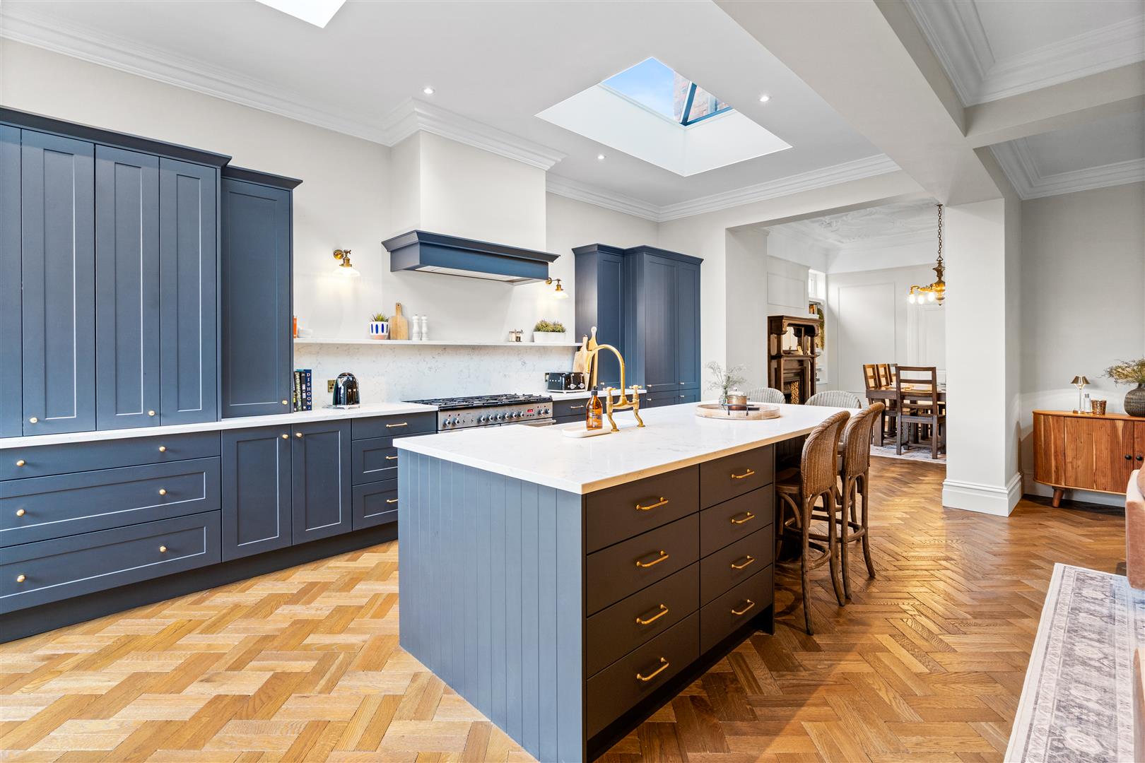 Stunning recently refitted and hugely extended kitchen/diner/family room with dual fuel fire, skylights, under floor heating, fitted with an array of shaker style wall, base, drawer and larder cabinetry, solid quartz counter tops, magnificent breakfasting island, Belfast sink with copper mixer tap, space for range cooker, integrated extractor, integrated fridge freezer, integrated dishwasher, new parquet flooring, wall lights, recessed spotlights, stylish doors opening to the rear, ample space to dine, entertain and relax.