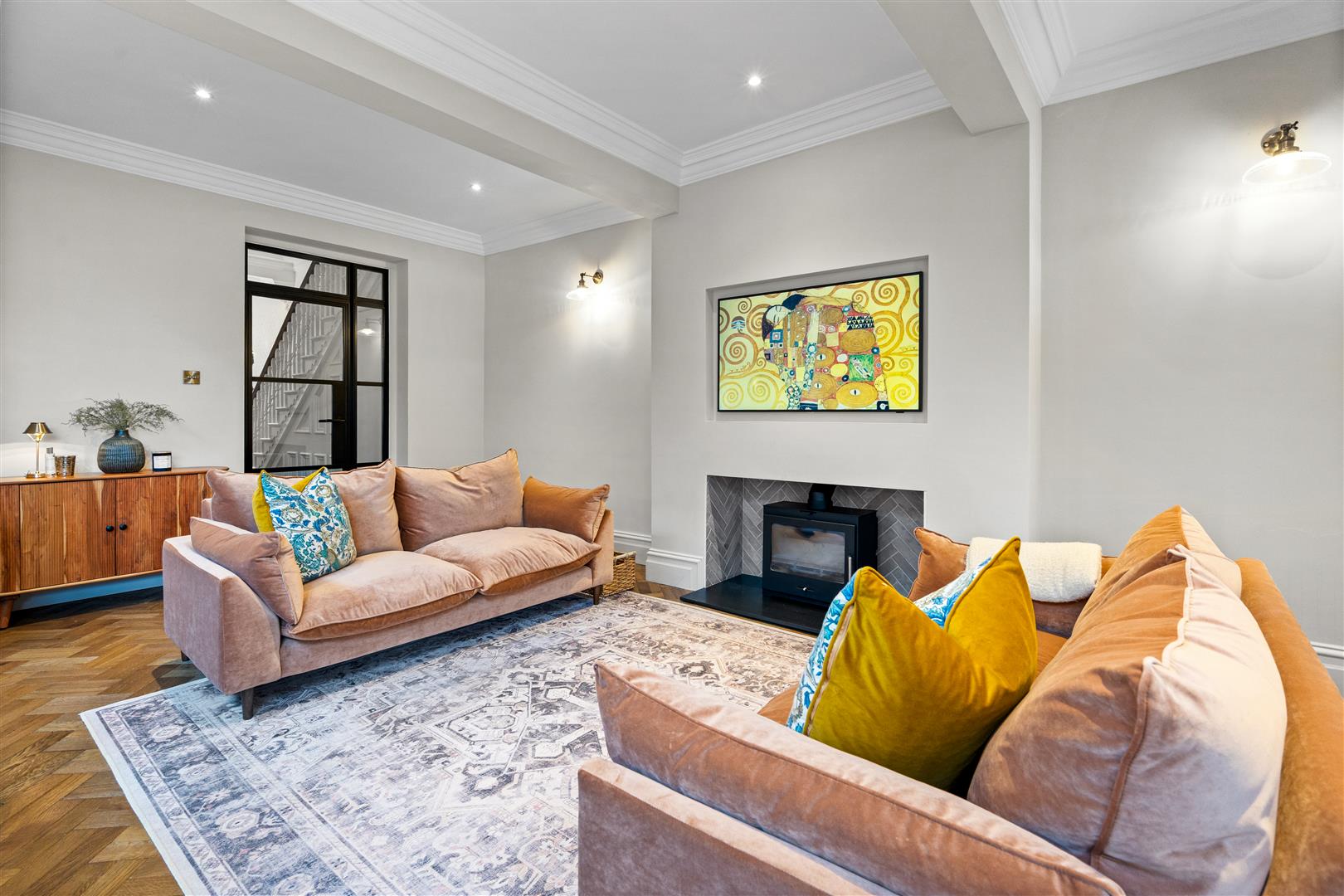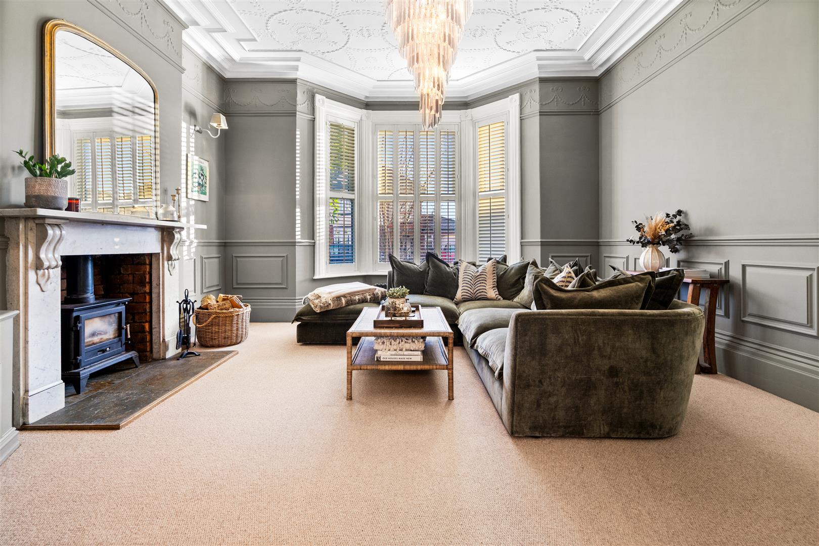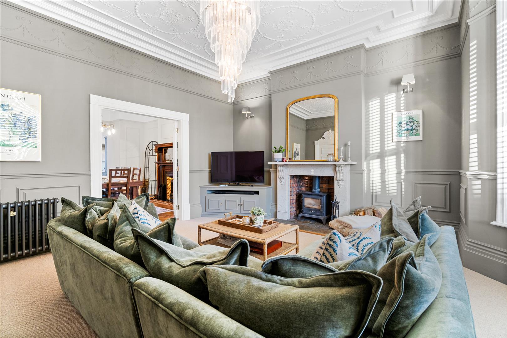 Superb lounge with bay window to the front elevation, fantastic ornate plasterwork, bespoke wall panelling, marble fireplace with log burner, stylish decor, ornate door frame.