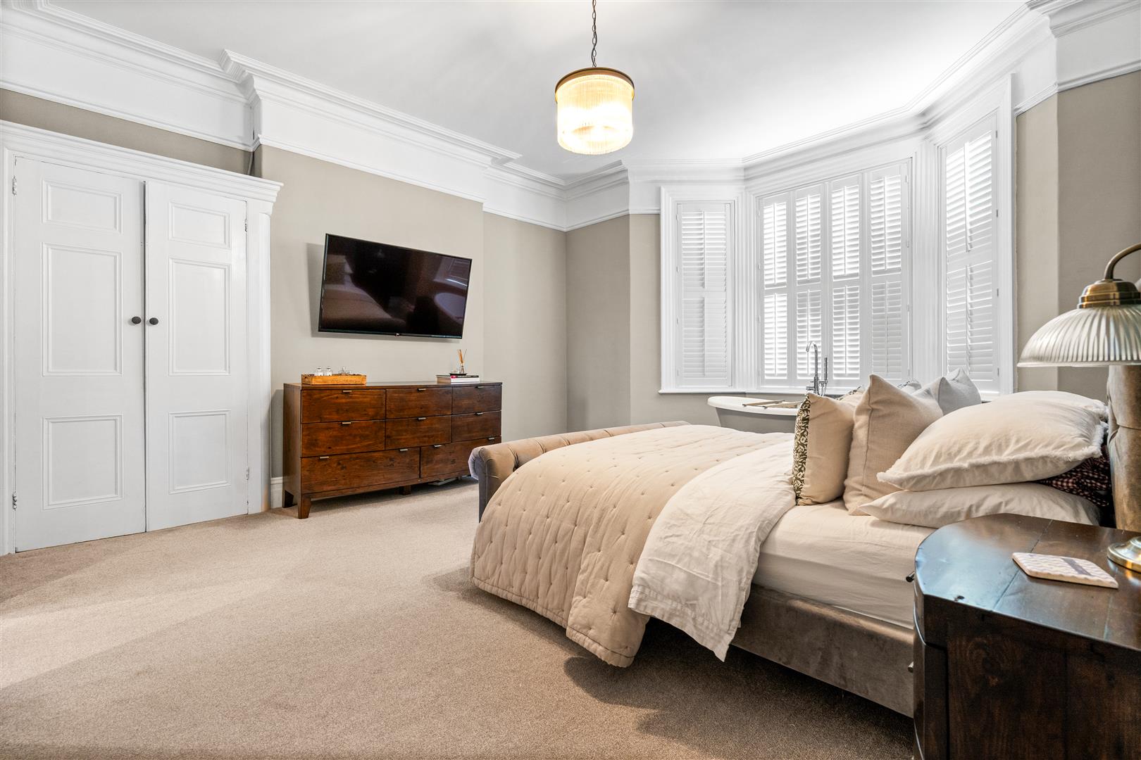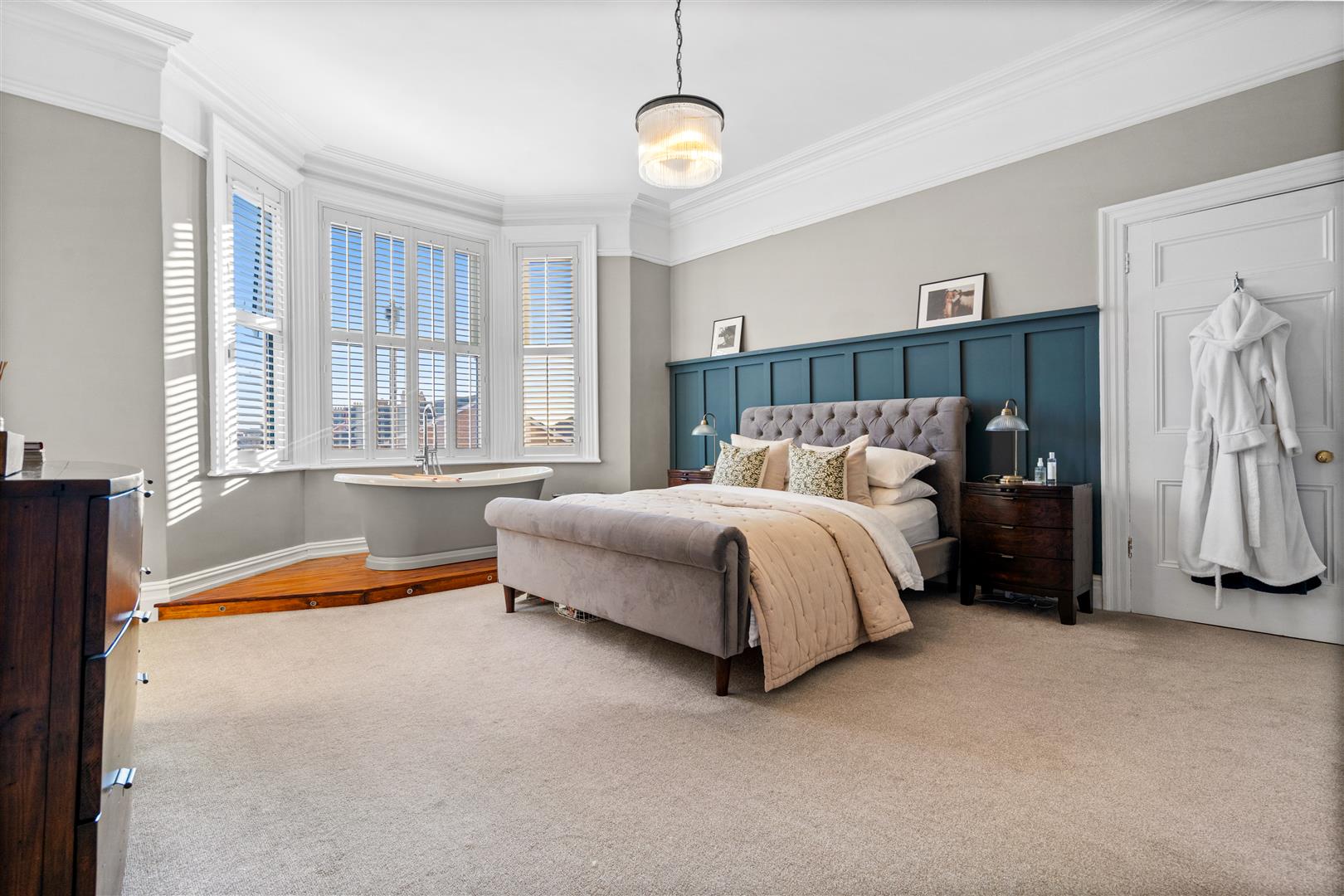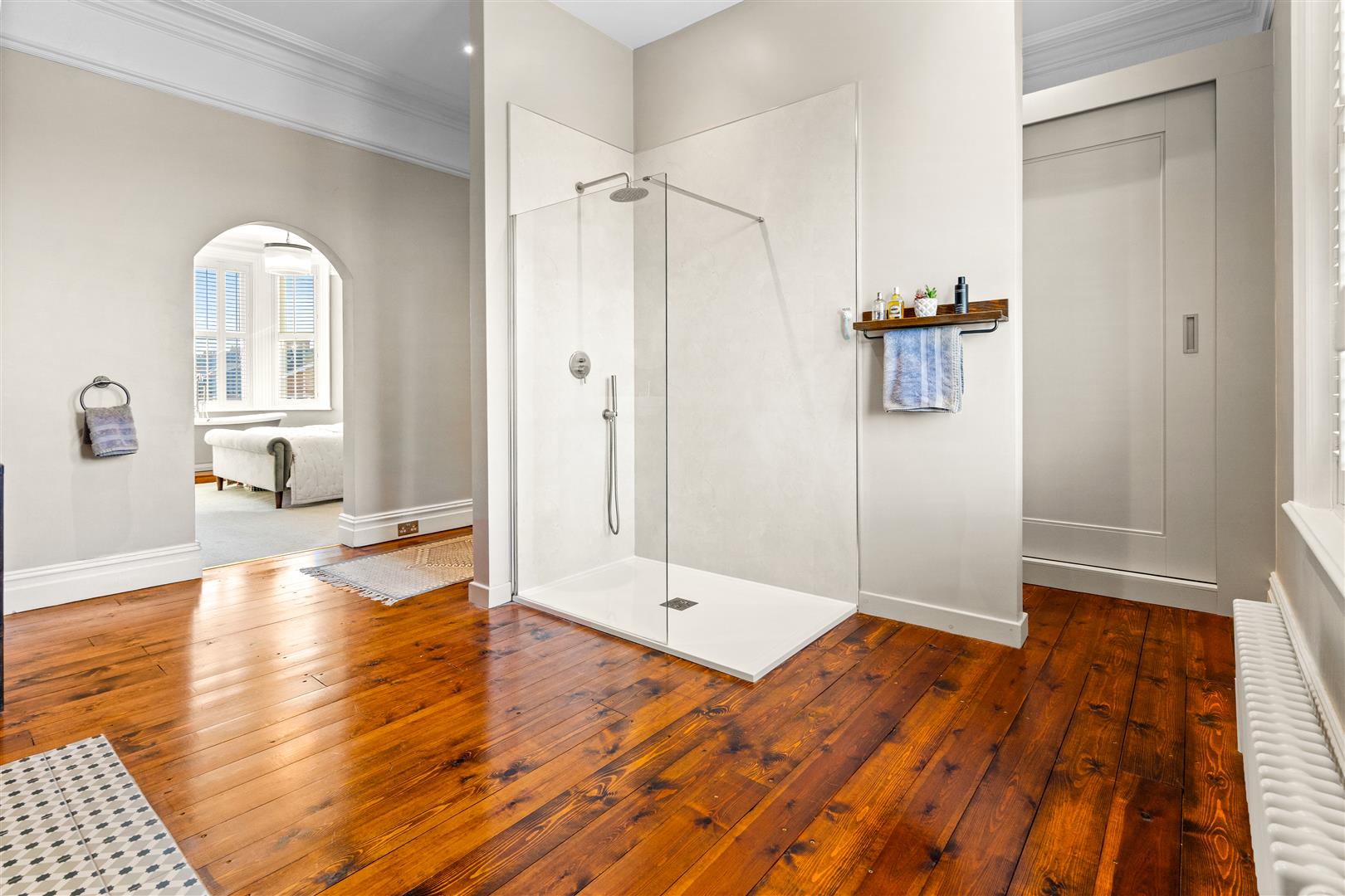 Bedroom one is an impressive double with bay window to the front elevation, freestanding period bath to raised wooden platform with floor mounted shower head taps, pristine decor, bespoke wall panelling, deep cornicing, walk in wardrobe and with access to;