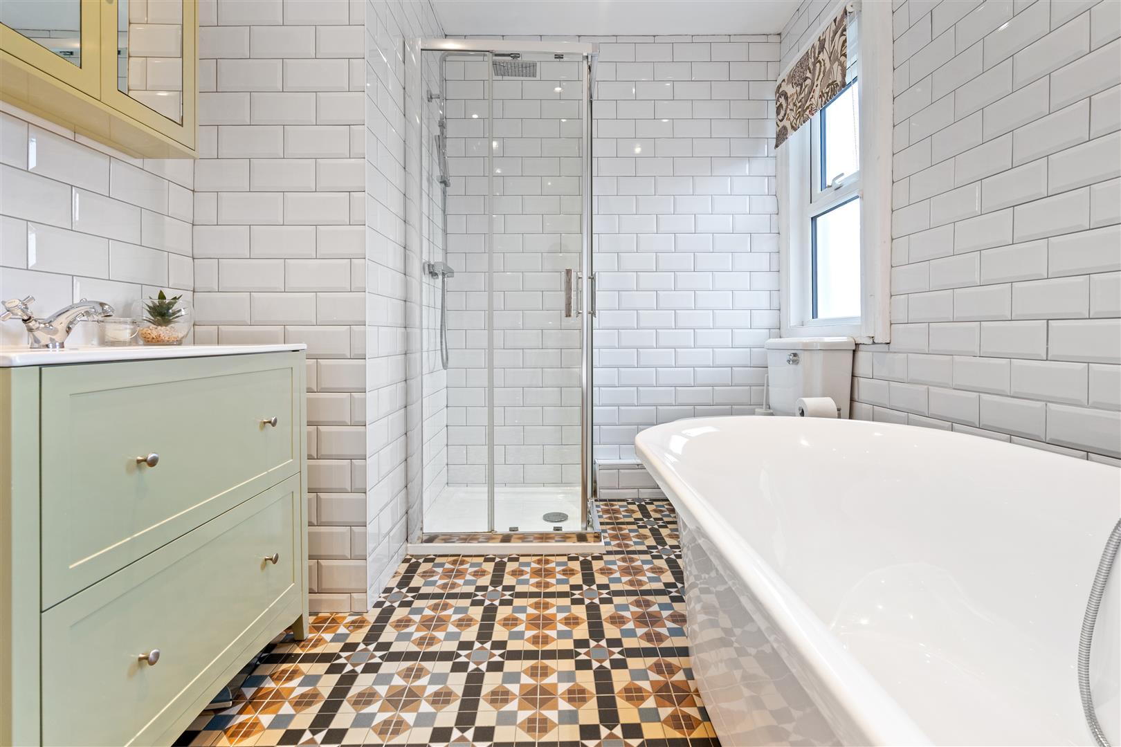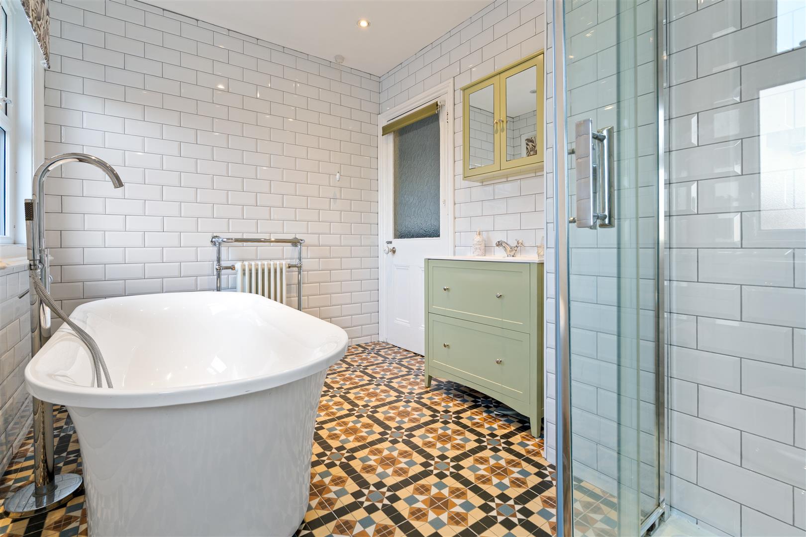 The large family bathroom comprises freestanding bath with floor standing mixer shower head tap, close coupled WC, vanity wash basin, walk in shower cubicle, complimentary subway tiling to walls, period style flooring, recessed spotlights.