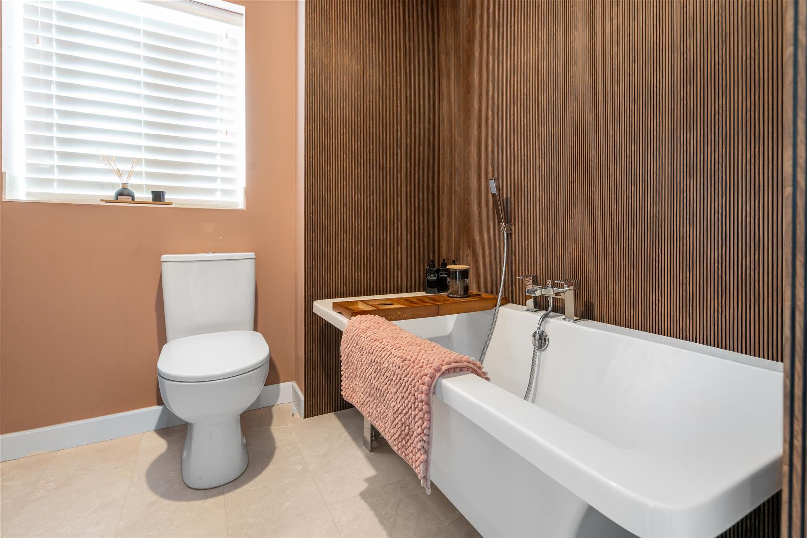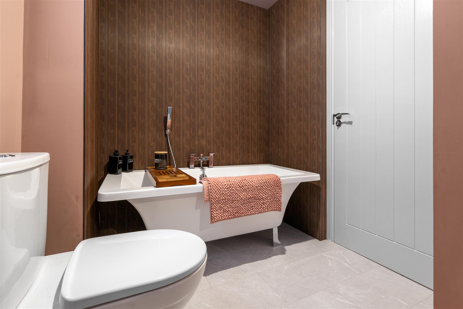 The stylishly appointed family bathroom comprises freestanding bath, close coupled WC and wash basin.
