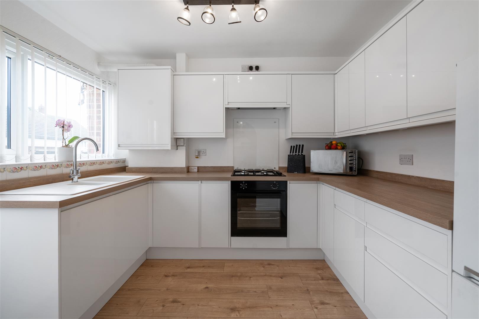 Excellent kitchen newly fitted with a selection of sleek wall, base and drawer cabinets, complimentary surfaces, integrated oven, integrated gas hob, integrated extractor, one and a half bowl sink with chrome mixer tap, plumbing for washing machine, space for fridge freezer, half glazed exterior door.