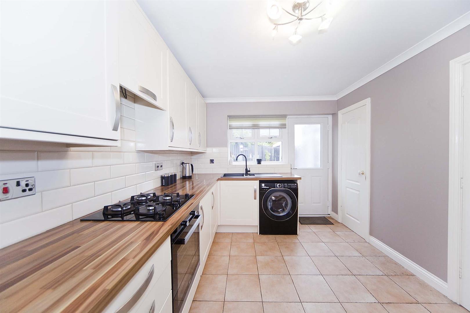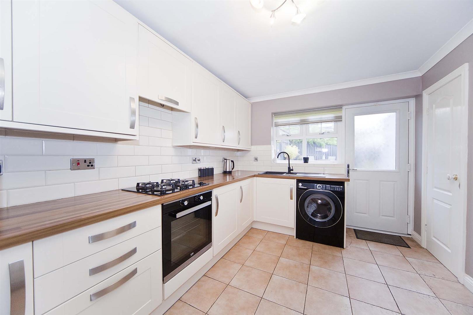 Well equipped kitchen comprising wall, larder, base and drawer cabinets, complimentary surfaces, subway tiled backsplash, integrated oven, integrated gas hob, integrated extractor, one and a half bowl cast sink with mixer tap, plumbing for washing machine, integrated fridge freezer, fitted storage cupboard, tiled floor, half glazed rear access door.