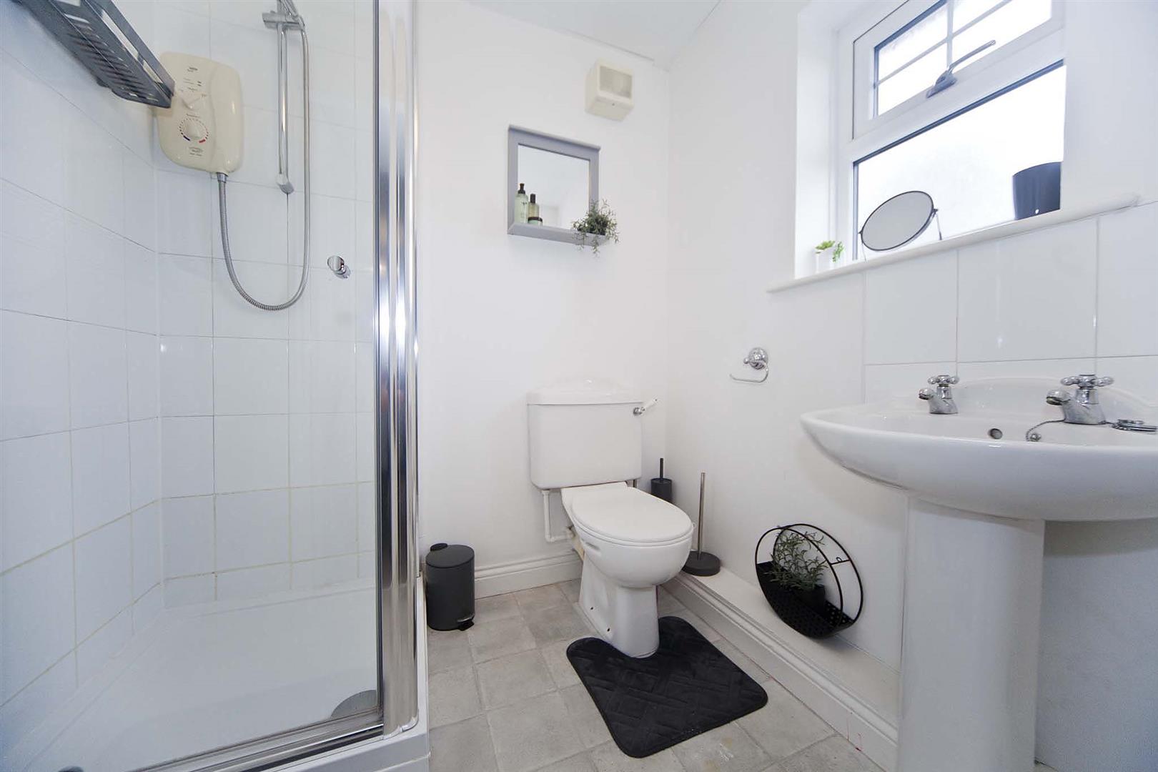 En suite shower room which comprises shower enclosure, close coupled WC and pedestal wash basin, complimentary tiling.