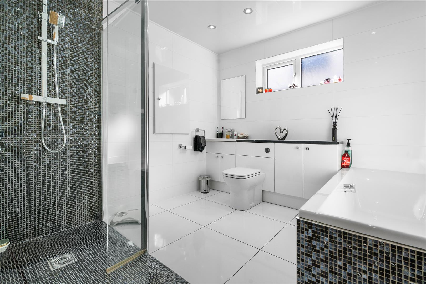 Stunning family bathroom comprising bath, oversized shower enclosure, concealed cistern WC and vanity wash basin with additional storage, recessed spotlights, beautiful tiling to walls and floor.