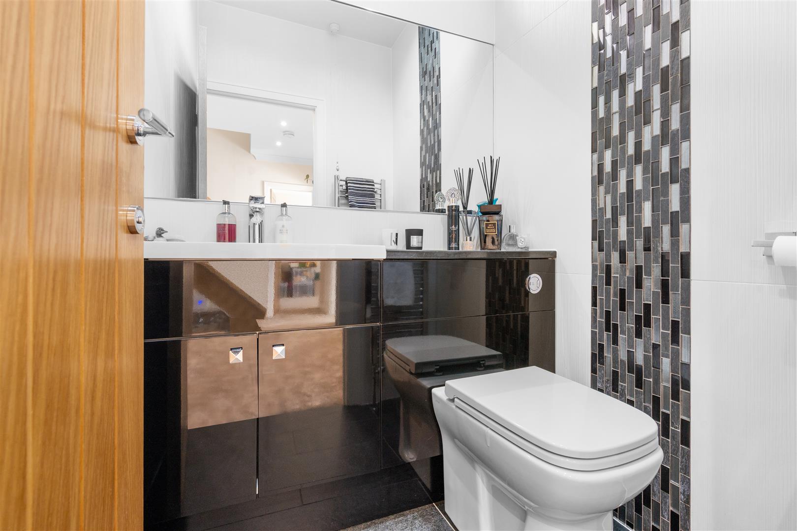 Guest cloakroom comprising concealed WC and vanity wash basin, stylish tiling incorporating large mirror, recessed spotlights, chrome heated towel rail.