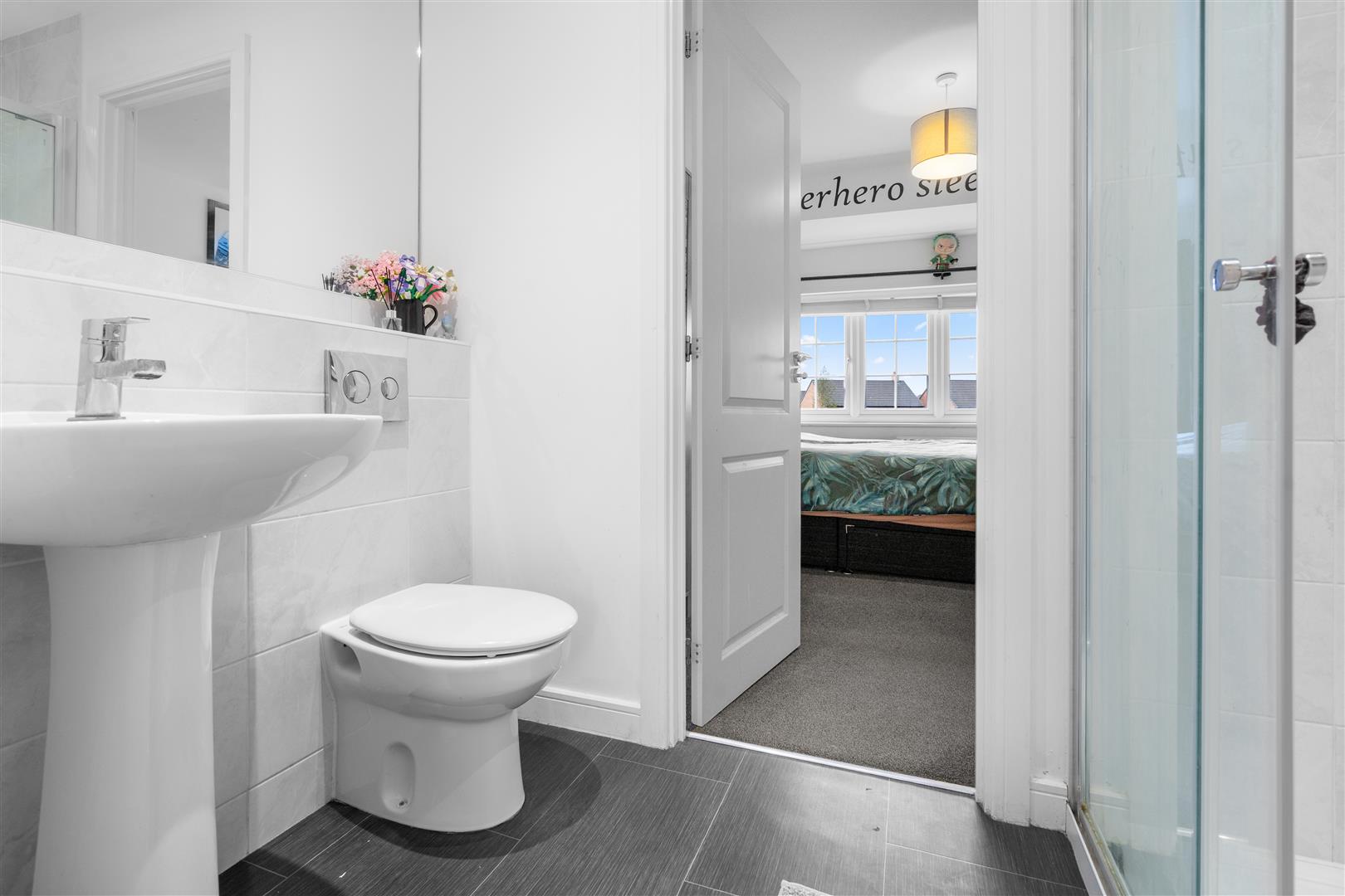 Jack and Jill suite with oversized shower enclosure, concealed cistern WC and pedestal wash basin, complimentary tiling, feature mirror.