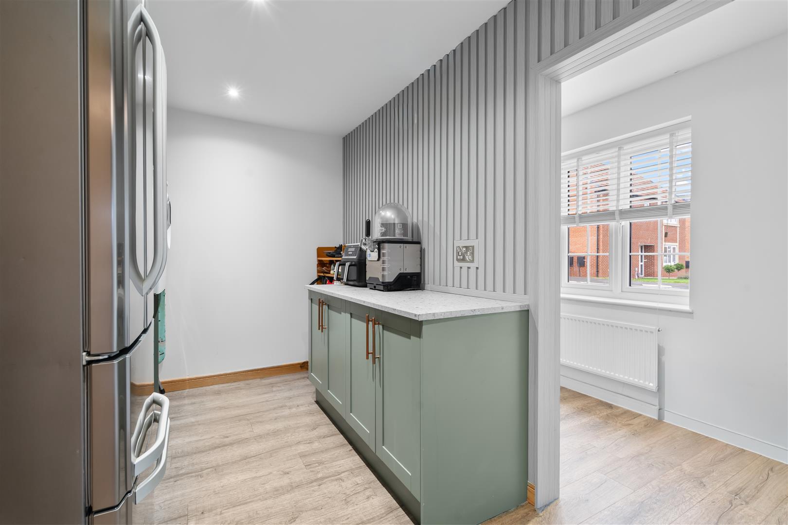 Utility room with space for appliances, an array of shaker fitted cabinets, work surfaces, space for fridge freezer.