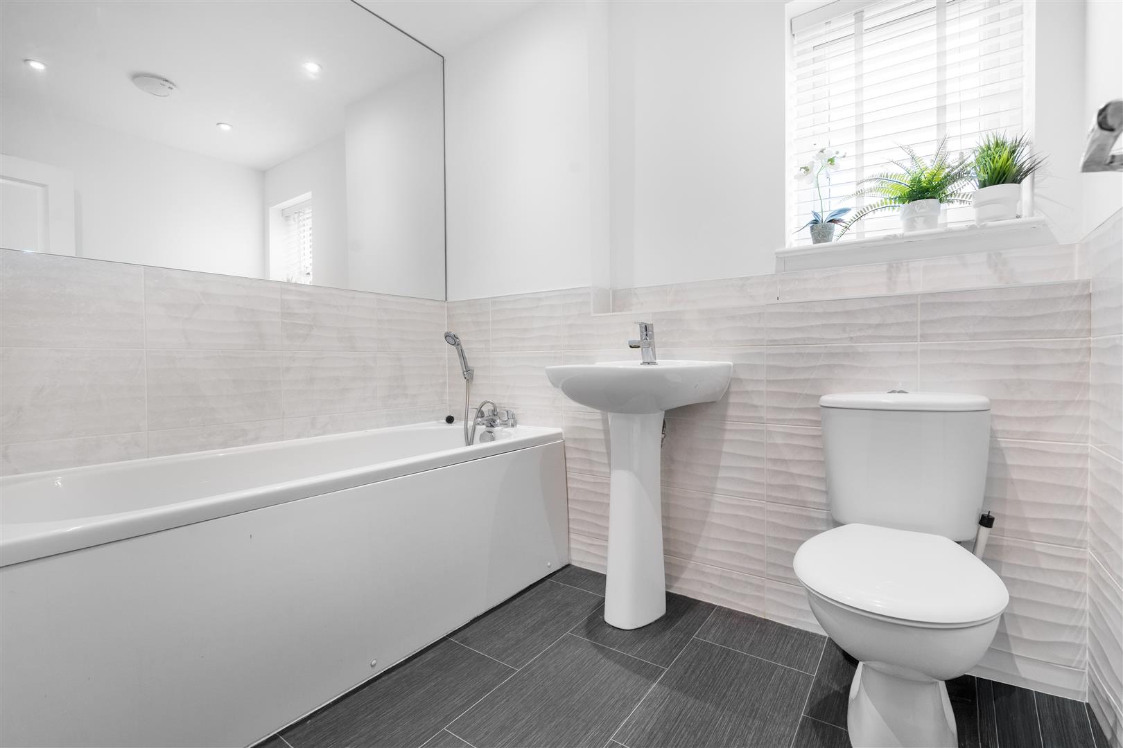 The family bathroom comprises bath with over bath shower, close coupled WC and pedestal wash basin, half mirrored wall, stylish tiling, recessed spotlights.