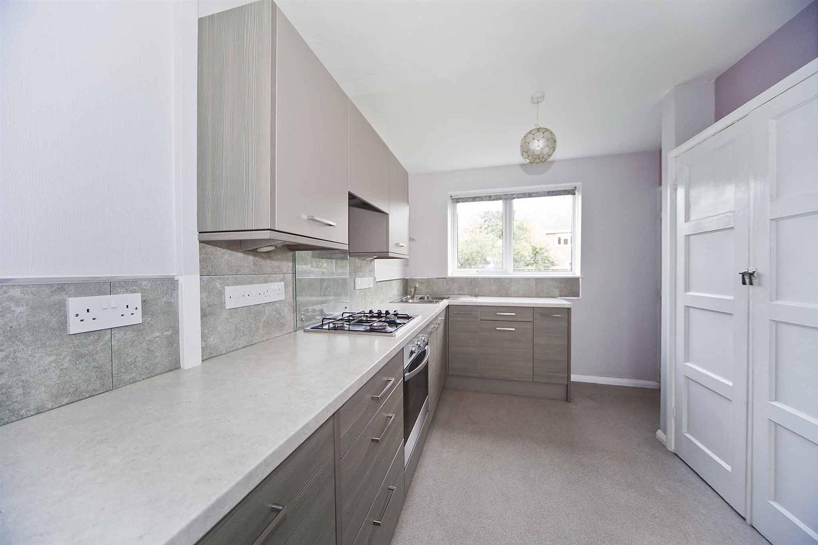 Open plan dual aspect kitchen diner fitted with a selection of modern wall, base and drawer cabinets, complimentary surfaces, tiled backsplash, integrated oven, integrated gas hob, integrated fridge, stainless sink with chrome mixer tap, space for appliances, fitted storage/pantry, ample space to dine.