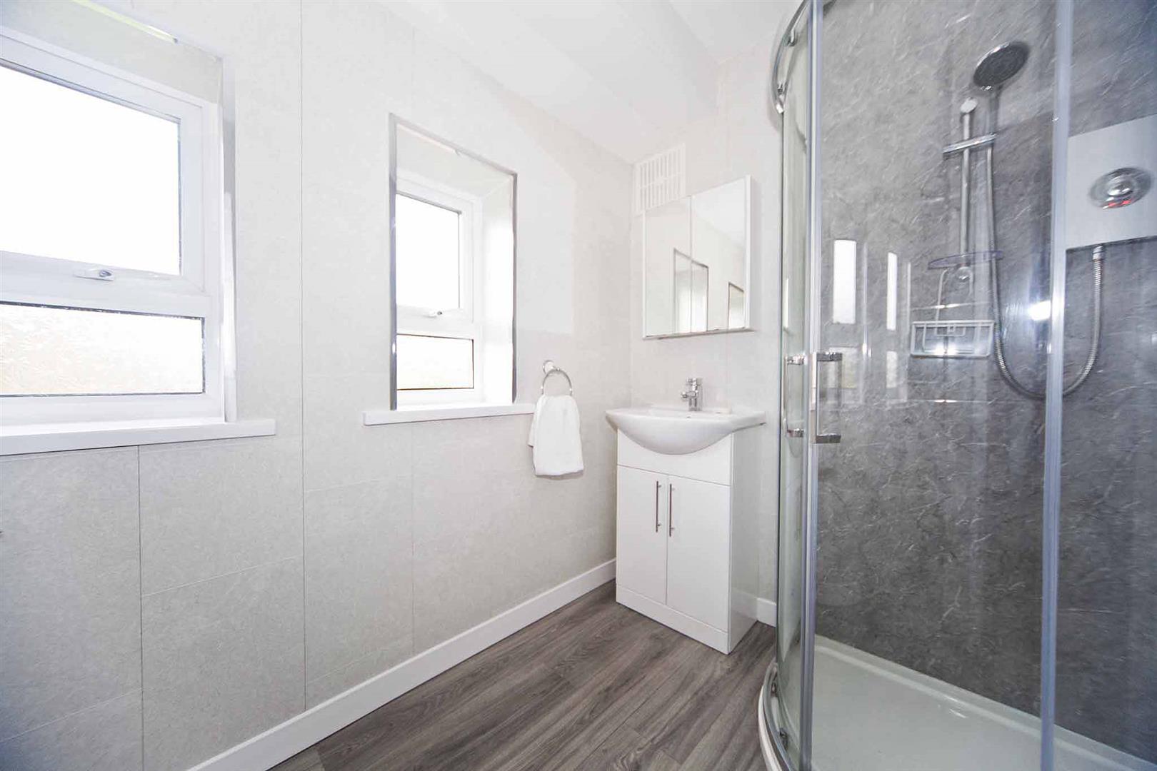 The modern shower room comprises quadrant shower enclosure, close coupled WC and vanity wash basin, dual windows, modern panelling.