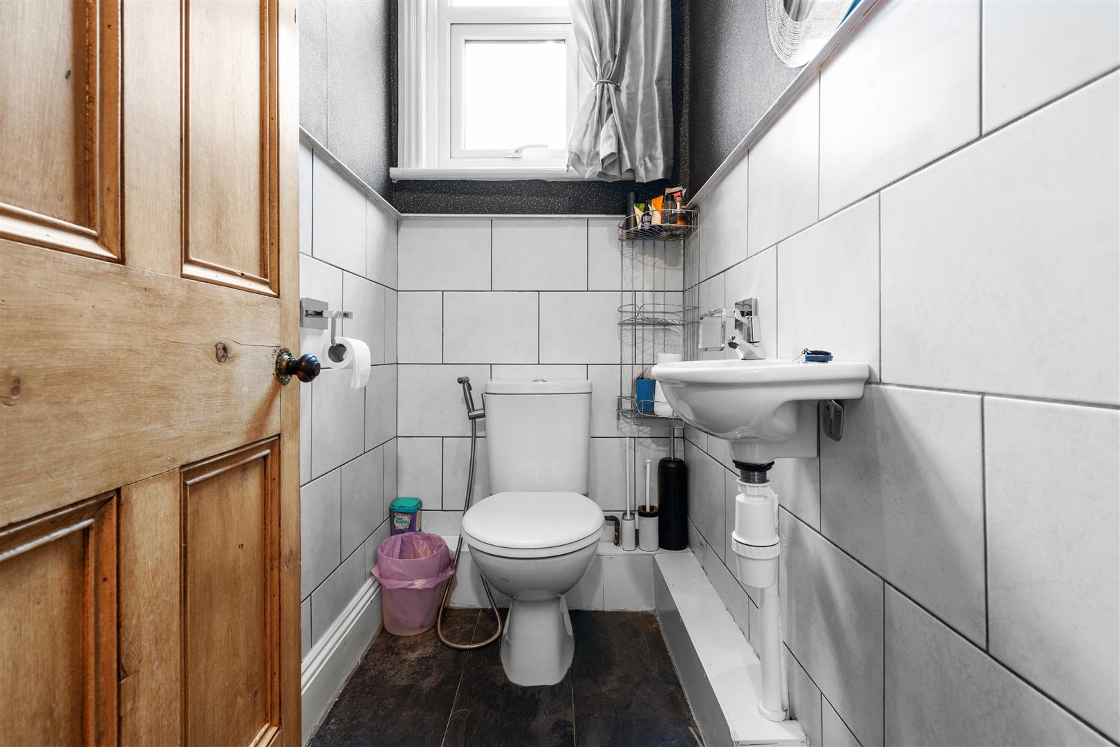 Separate WC comprising close coupled porcelain, wall mounted wash basin, half tiled walls.