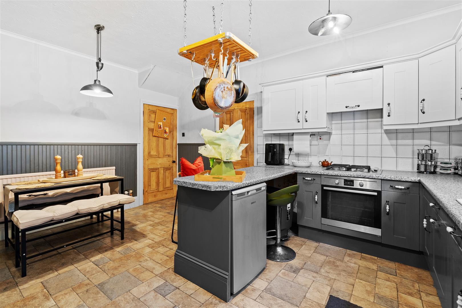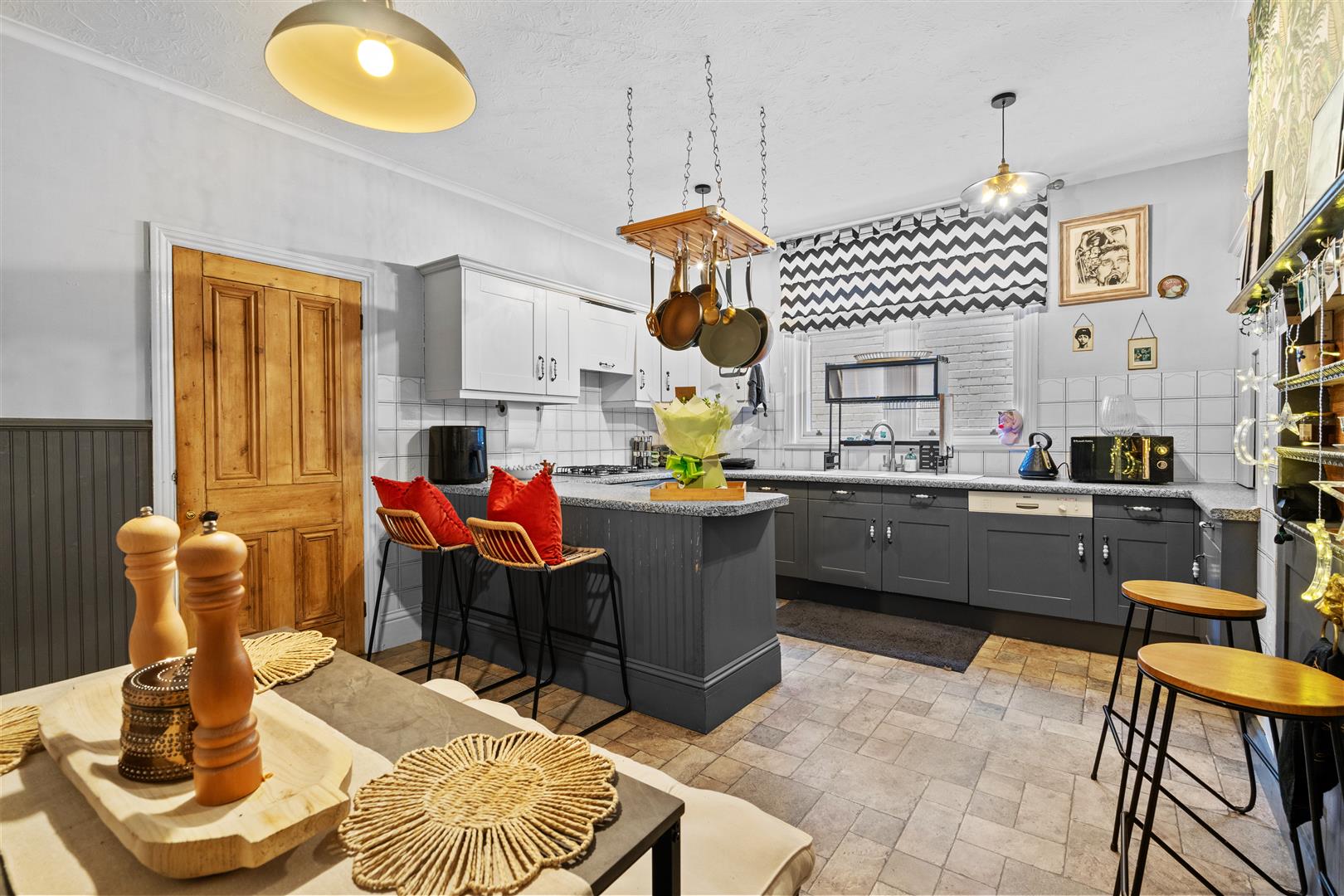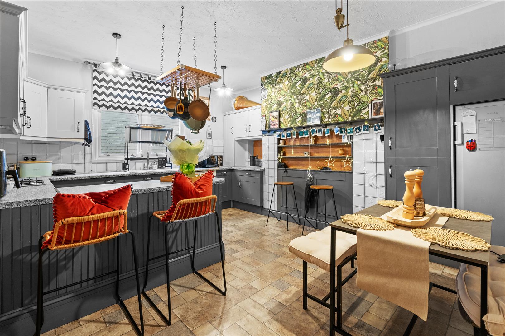 Fabulous dining kitchen fitted with an array of two tone wall, base, larder and drawer cabinetry complimentary surfaces, tiled backsplash, integrated oven, integrated gas hob, integrated extractor, space for freezer, ceramic sink with chrome mixer tap, space for appliances, built in dresser, breakfasting island, ample dining space, bespoke panelling, tiled flooring.