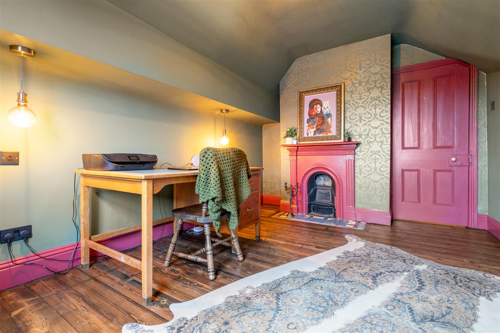 Study with generous bay window, tasteful decor, fabulous cast fireplace with tiled hearth, picture rail, decorative coving, exposed floorboards, bespoke built cabinetry and shelving.