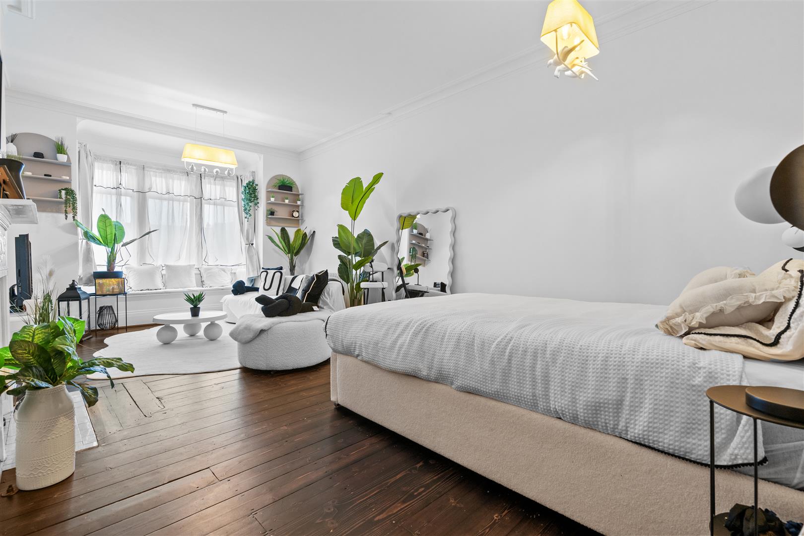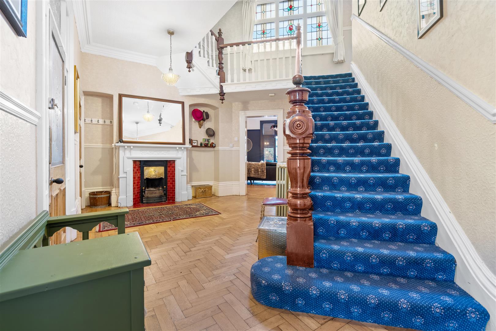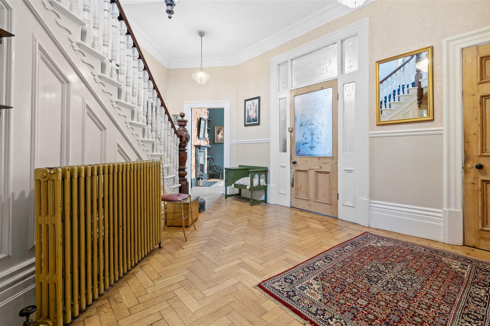 Generous entrance hallway with imposing original stairs to the first floor accommodation, under stairs storage cupboard, etched glazed door and windows to entrance, beautiful herringbone parquet flooring, high ceiling, deep skirting and coving, dado rail, original feature fireplace with brick hearth and upstand and ornate cast fire, neutral decor, cast radiator.