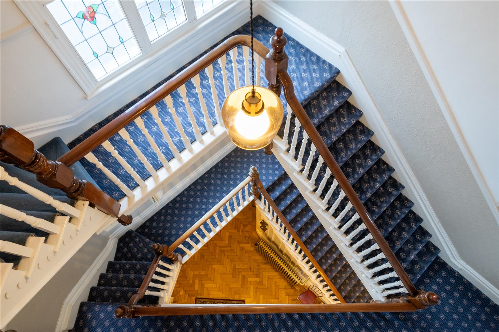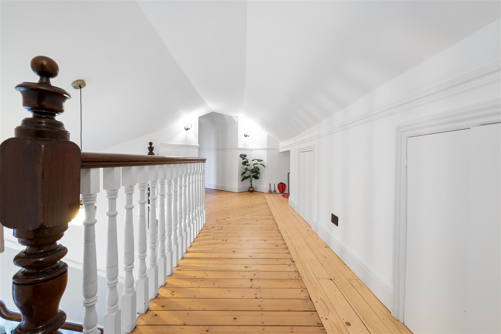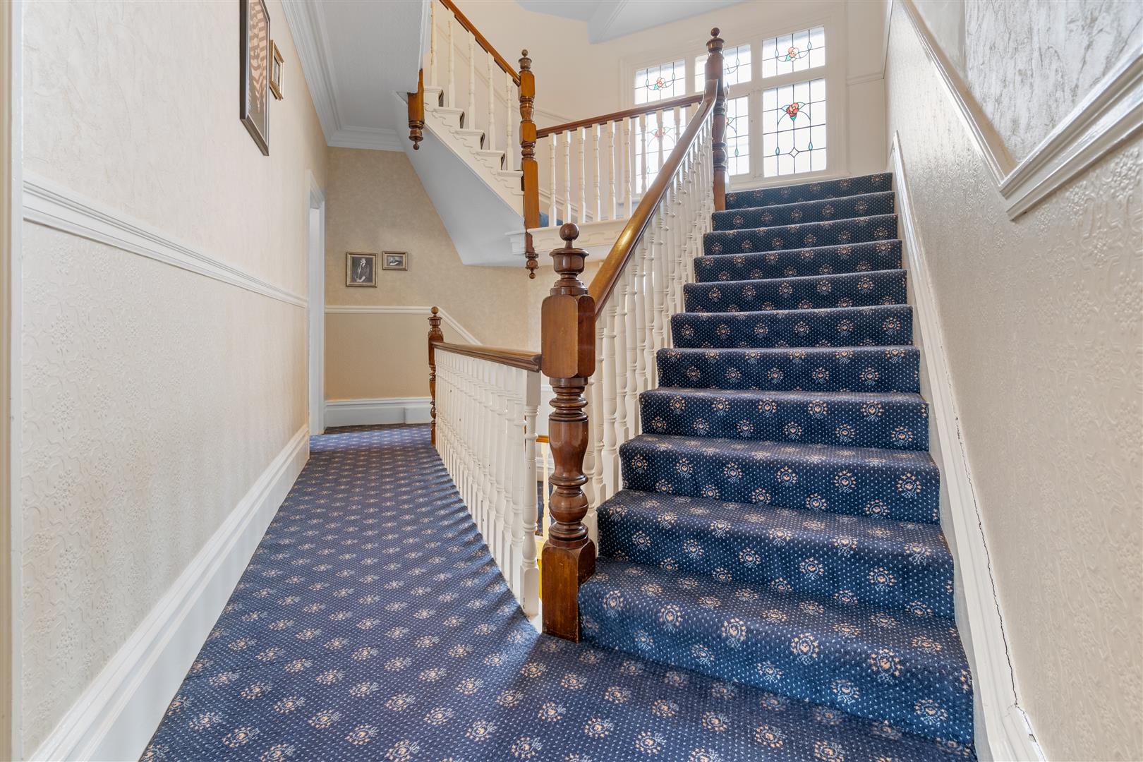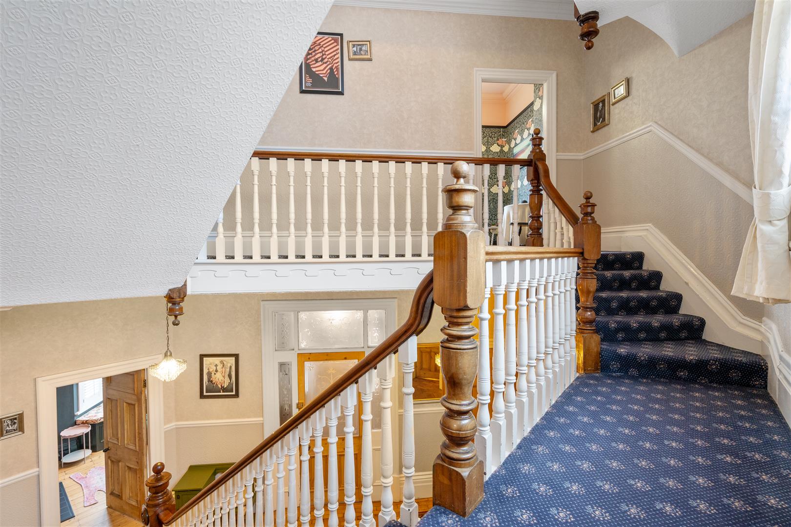 To the first floor, there is a generous landing with beautiful stained glass picture window, dado rail, decorative coving, excellent decor which leads to;