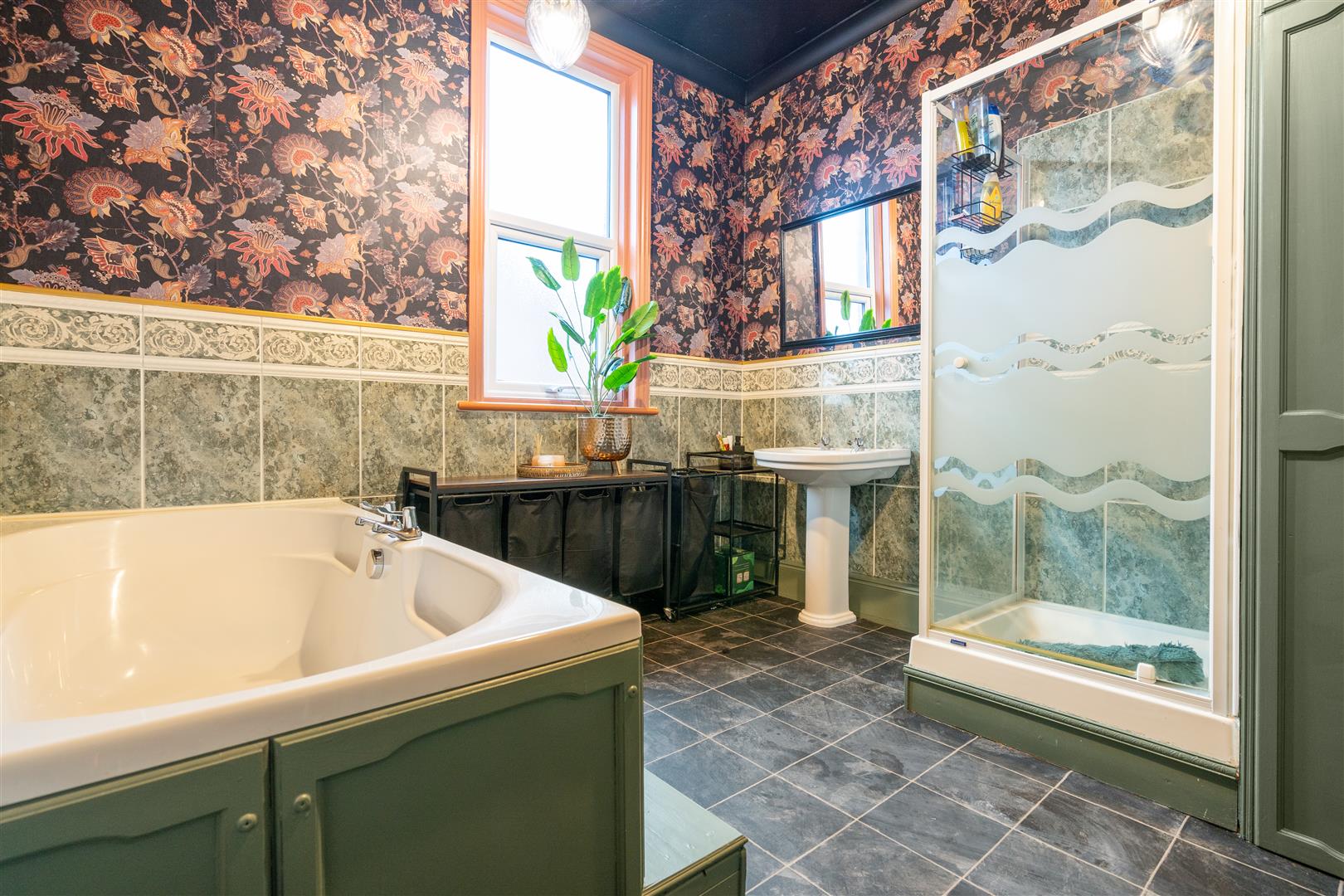Family bathroom comprising large bath, shower enclosure and pedestal wash basin, complimentary tiling and decor, fitted storage.