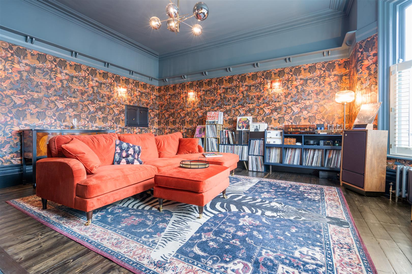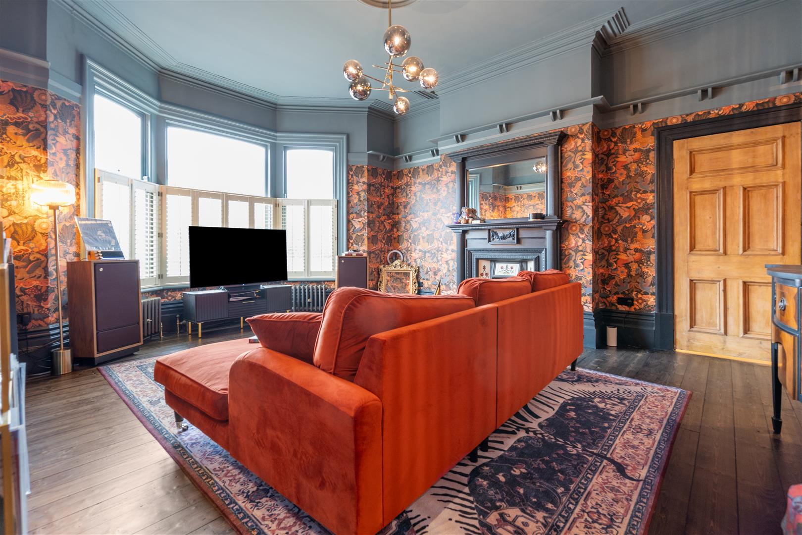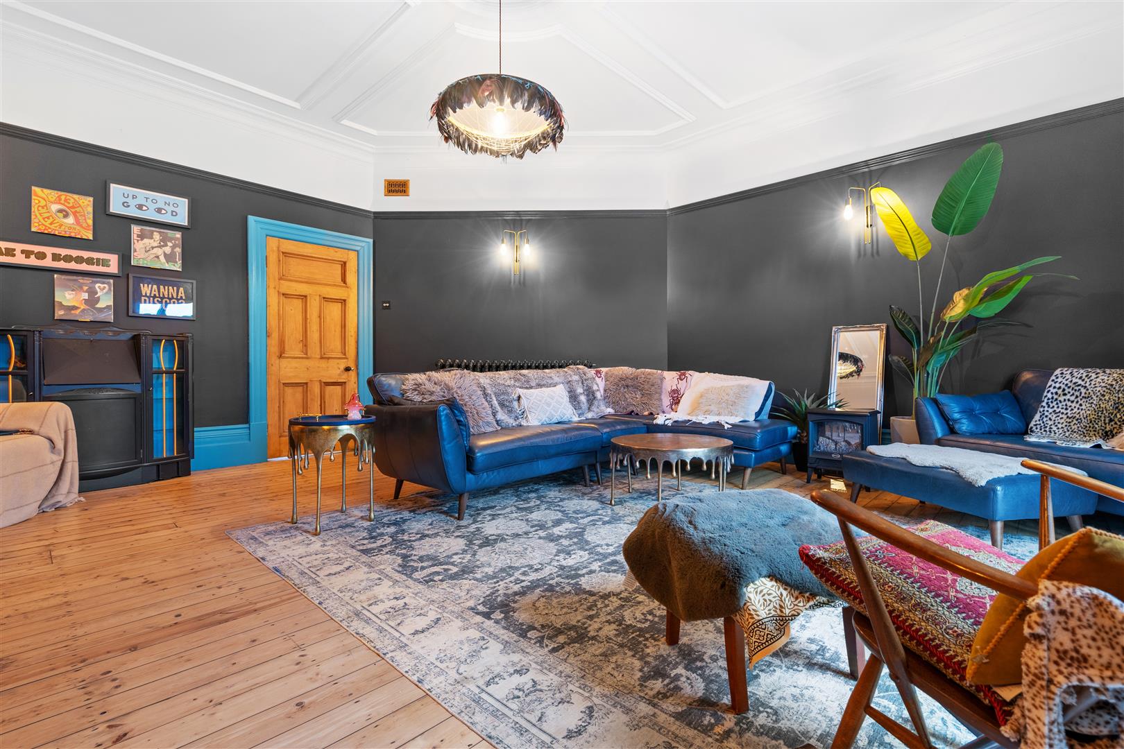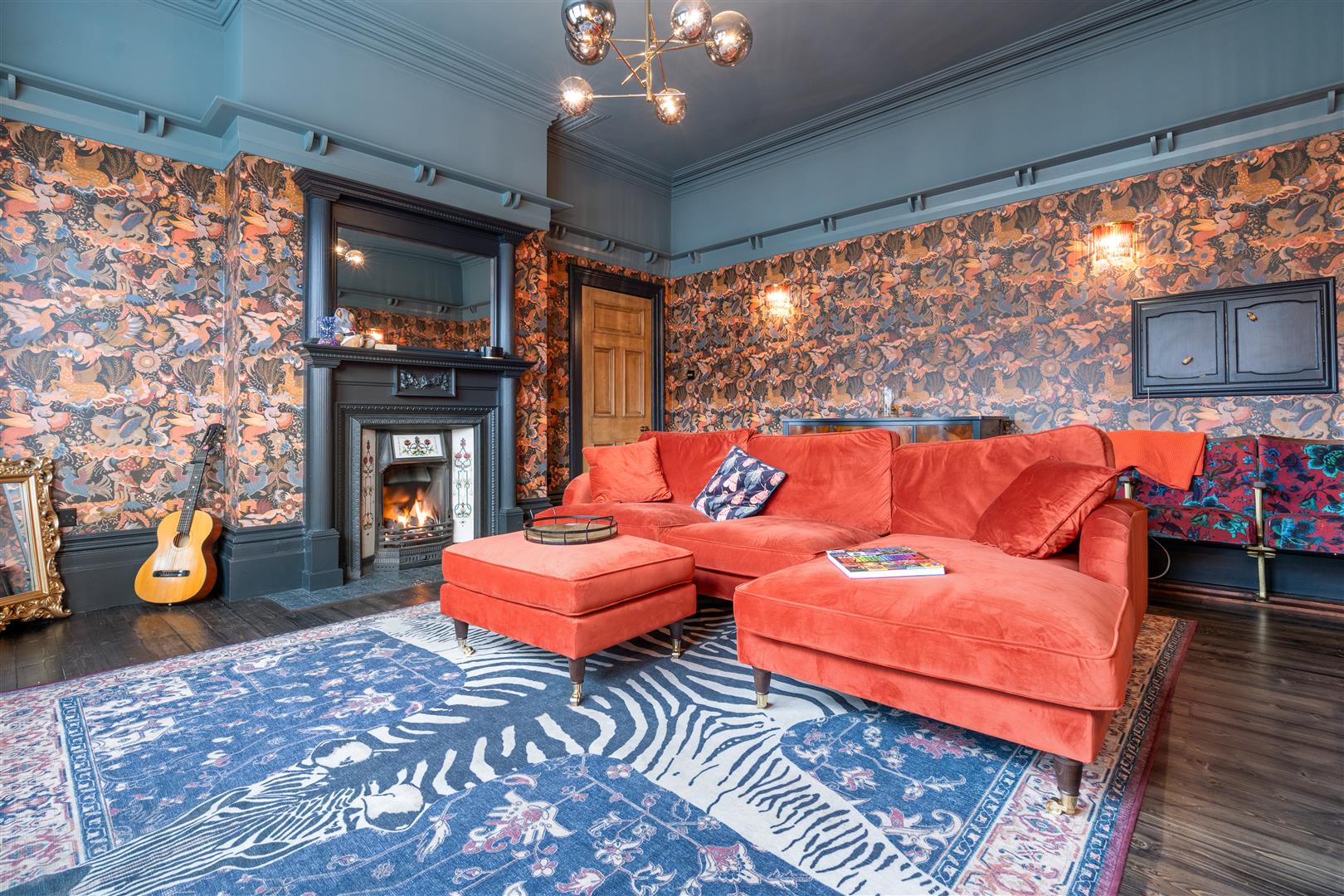 Stylish lounge of huge proportions with feature fireplace, tiled hearth and upstand, cast fire, picture rail, deep coving/plasterwork and ceiling rose, exposed floorboards, striking decor, door and full height widows to;