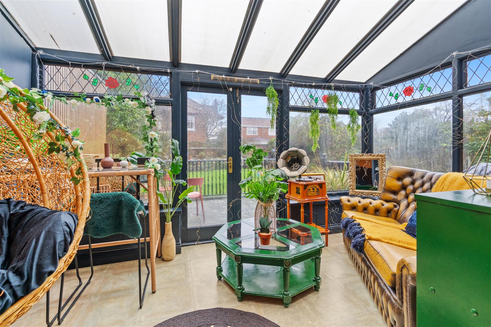 Sunny conservatory with tiled flooring, stained glass windows, French doors opening to rear garden.