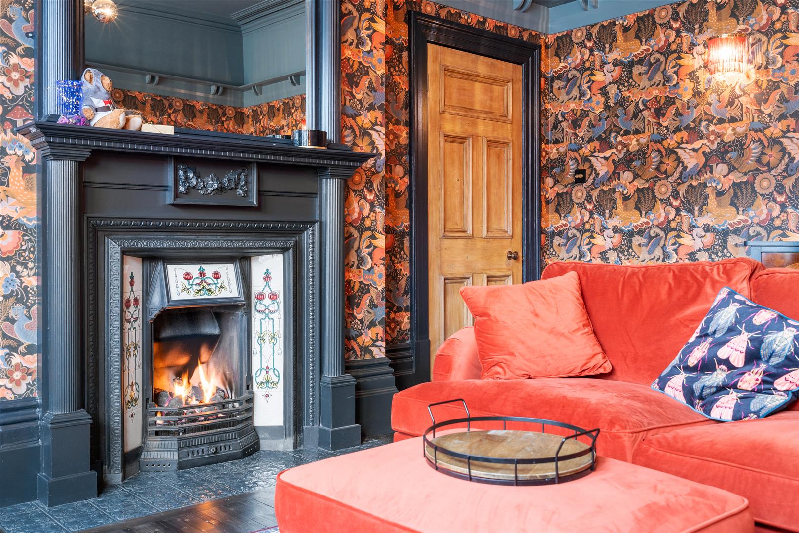 Bedroom two is a sizable double with bay window, window seat, exposed floorboards, immaculate decor, cast fireplace and open fire.
